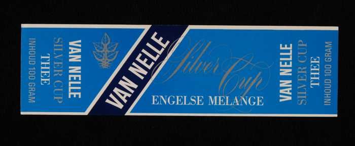 Blauw, papieren label VAN NELLE SILVER CUP THEE, Eng...