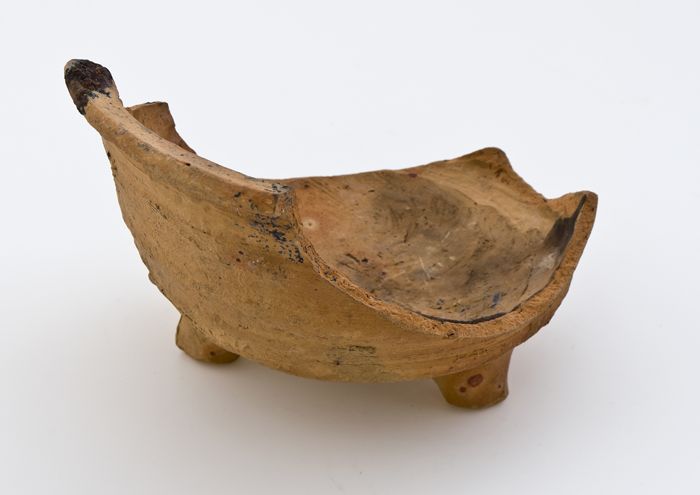 Fragment van ongeglazuurde test op drie poten, zijwa...