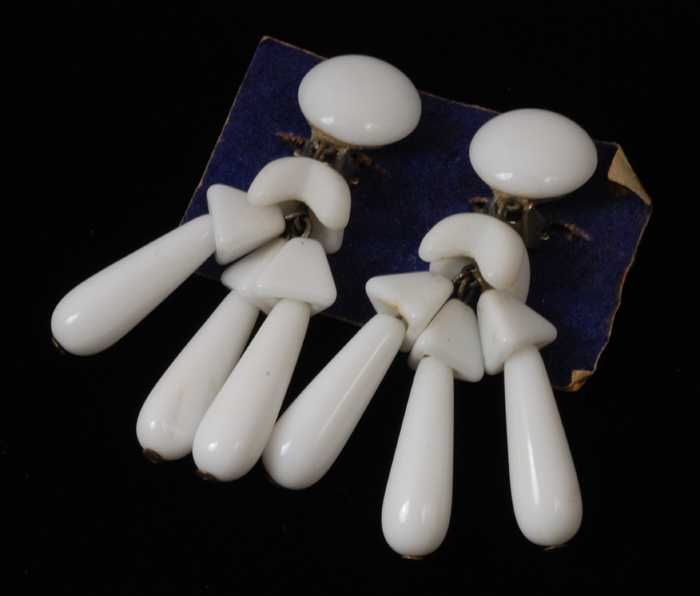 Paar oorbellen, clip met bladvorm van wit glas, op b...