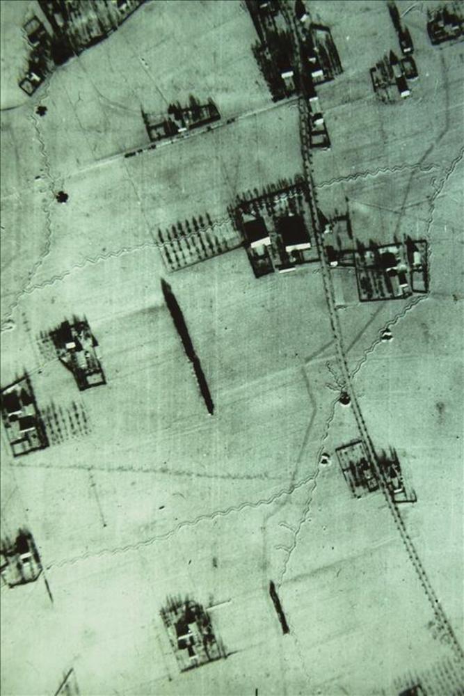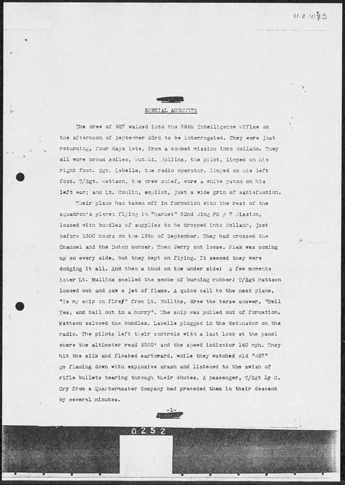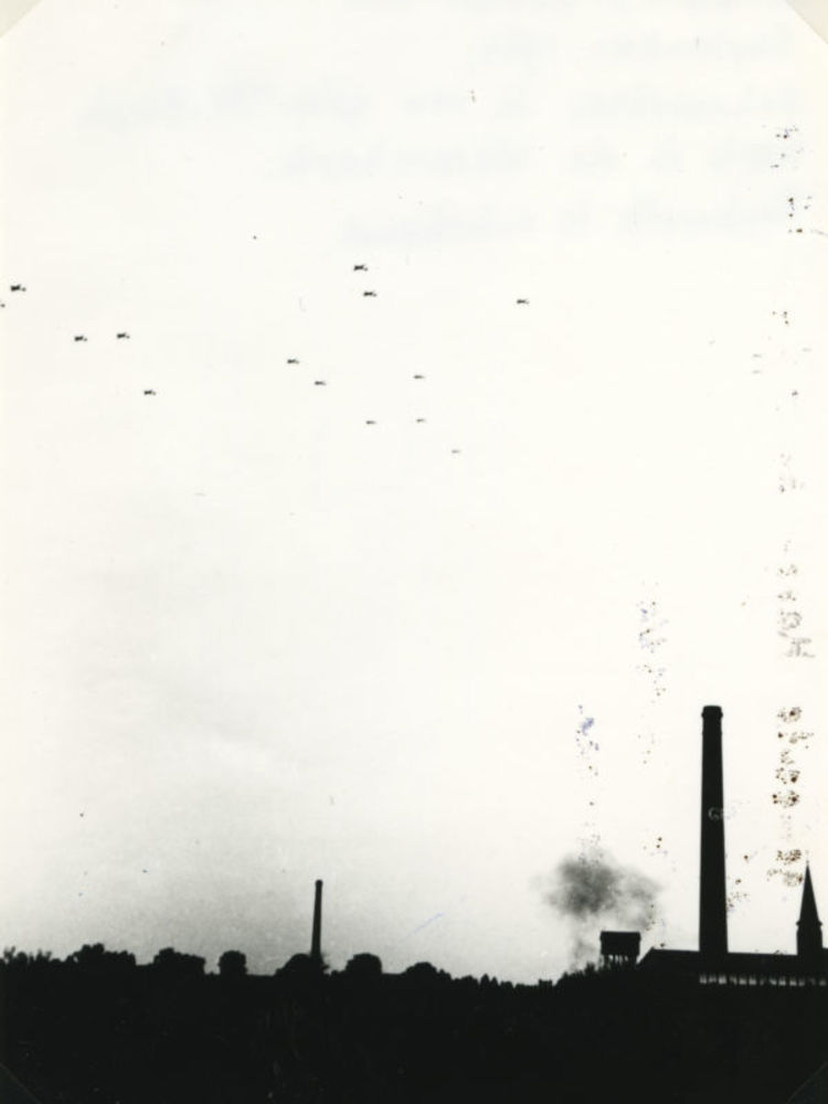 Foto van formatie C-47 Dakotas boven fabriek. Tekst ...