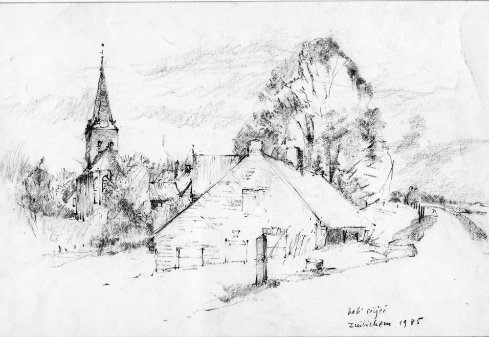 Dijk bij Zuilichem in 1985, tekening door Bab Siljée.