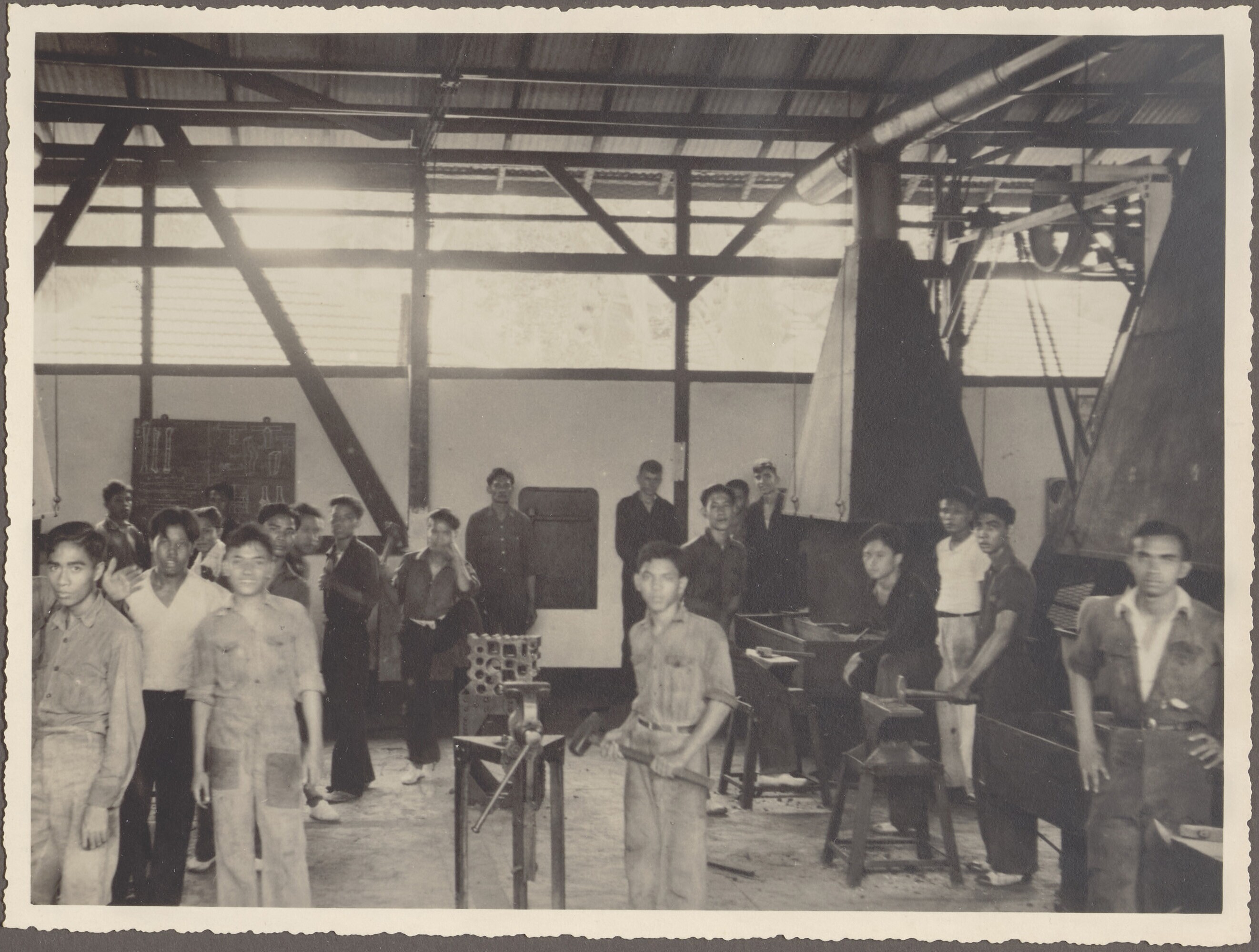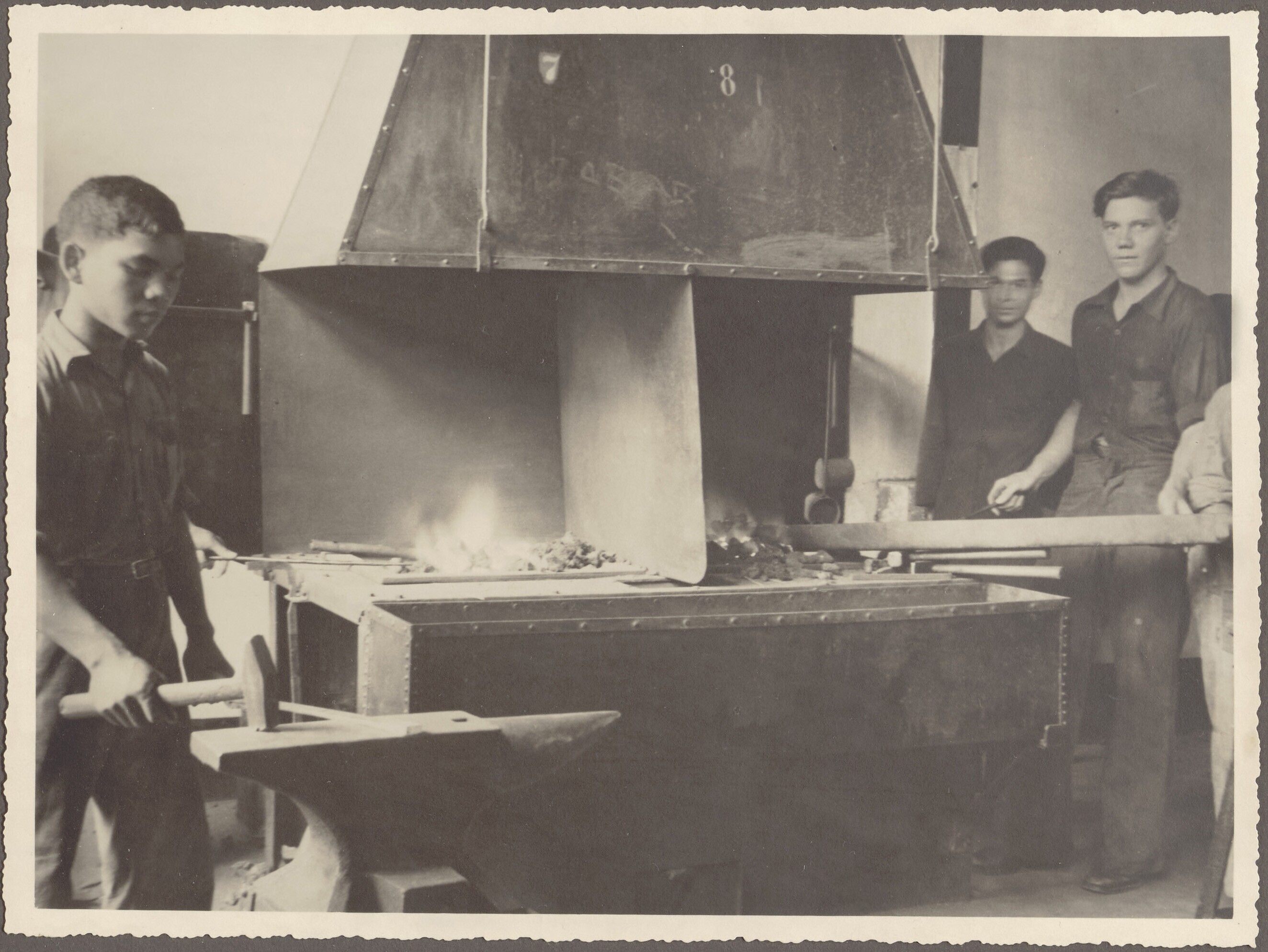 Leerlingen in de smederij van openbare ambachtsschoo...