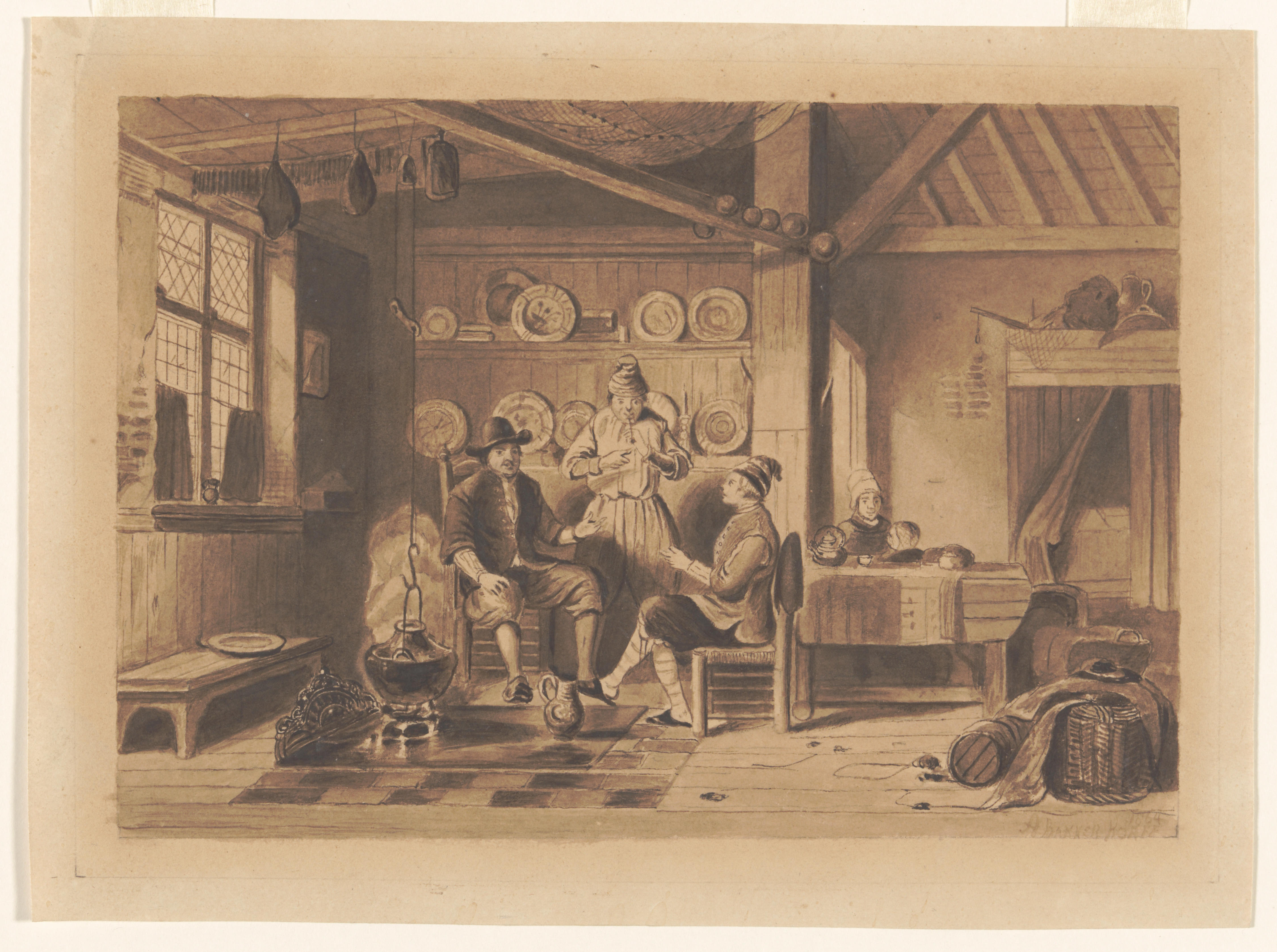Drie mannen, vrouw en kind in Marker interieur, 1864