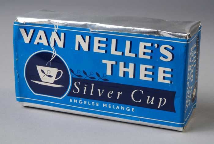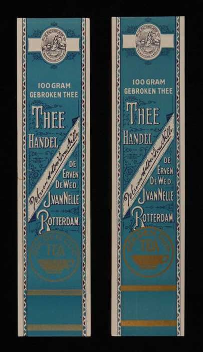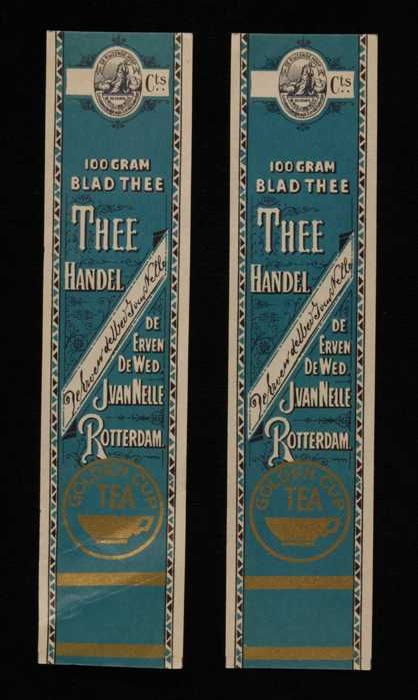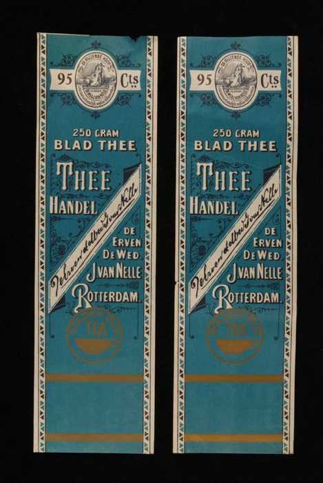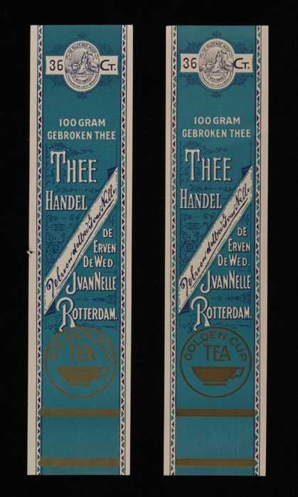 Twee blauwe labels VAN NELLE'S SILVER CUP THEE, Enge...