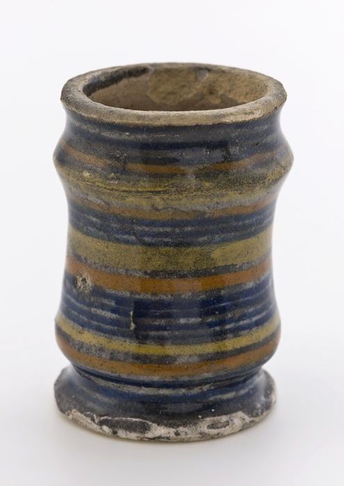 Aardewerk zalfpot, majolica albarello met drie insno...