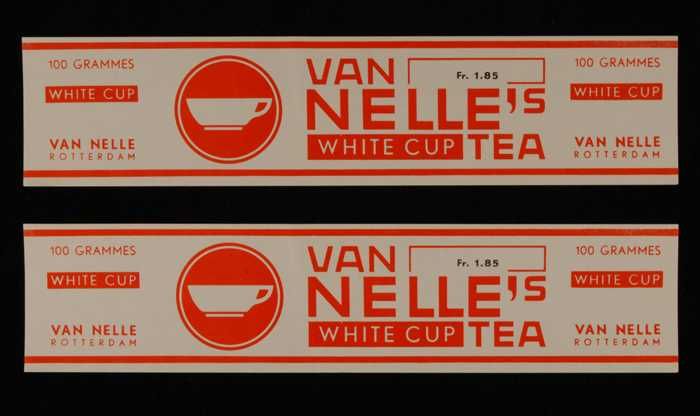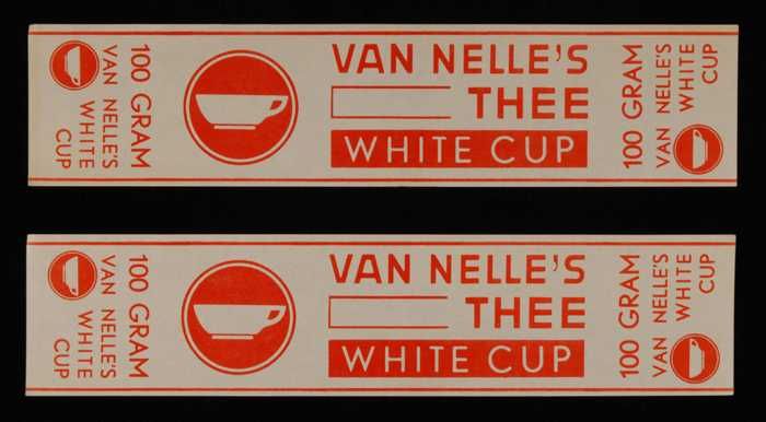 Twee witte, papieren labels VAN NELLE'S WHITE CUP TH...