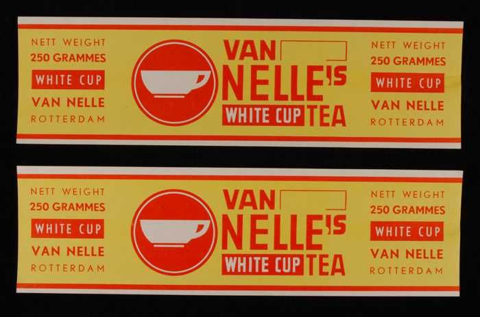 Twee gele, papieren labels VAN NELLE'S WHITE CUP THE...