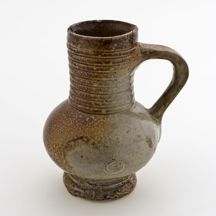 Kleine steengoed kruik op standvlak, gedrongen buik ...