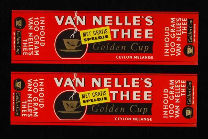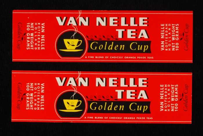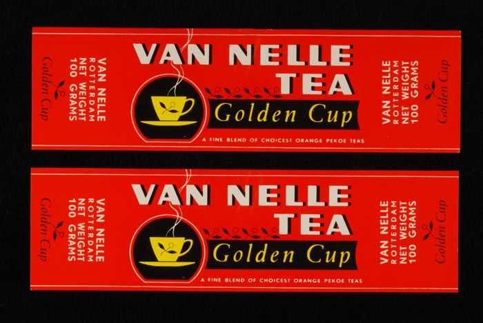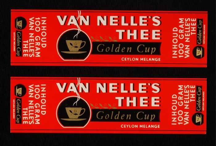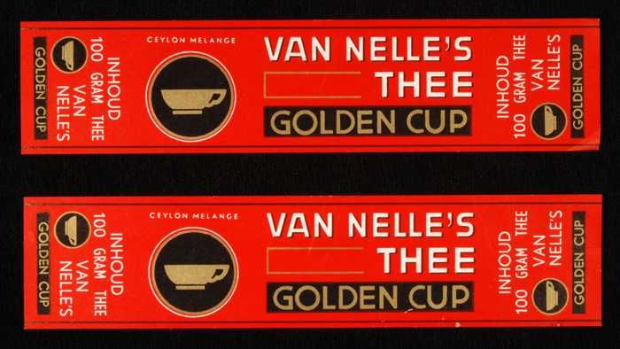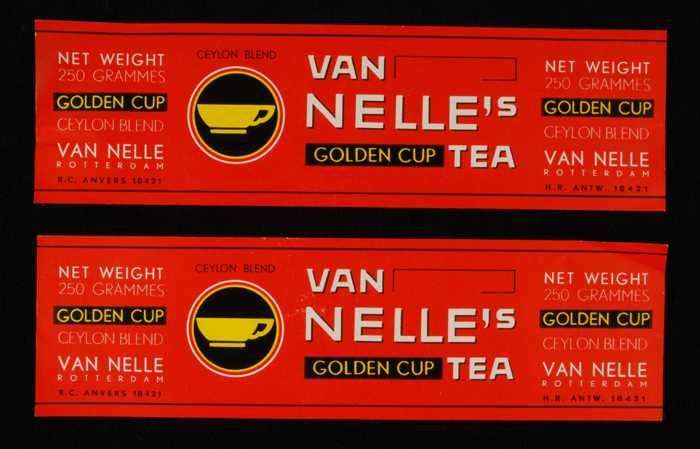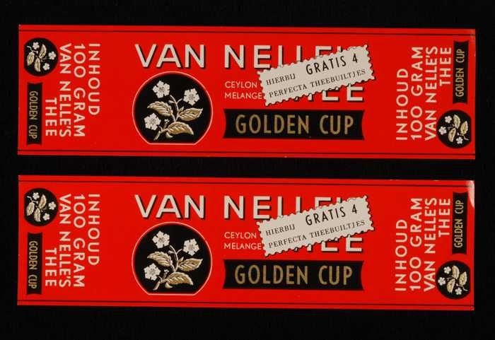 Twee rode, papieren labels VAN NELLE'S GOLDEN CUP TH...