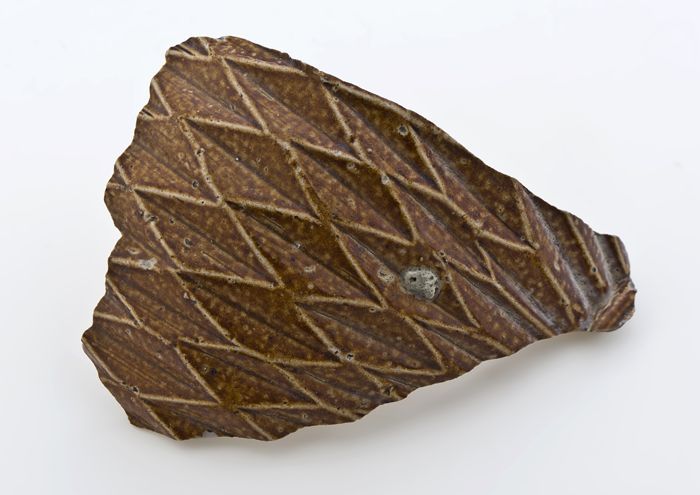 Buikfragment van steengoed kruik met geometrisch pat...