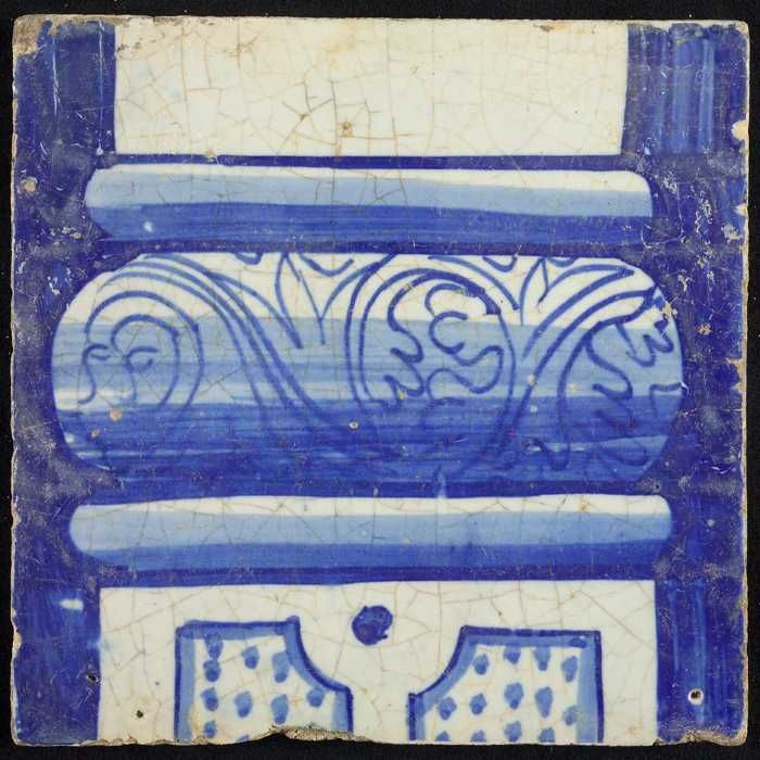 Tegel van schoorsteenpilaster, blauw op wit, onderzi...