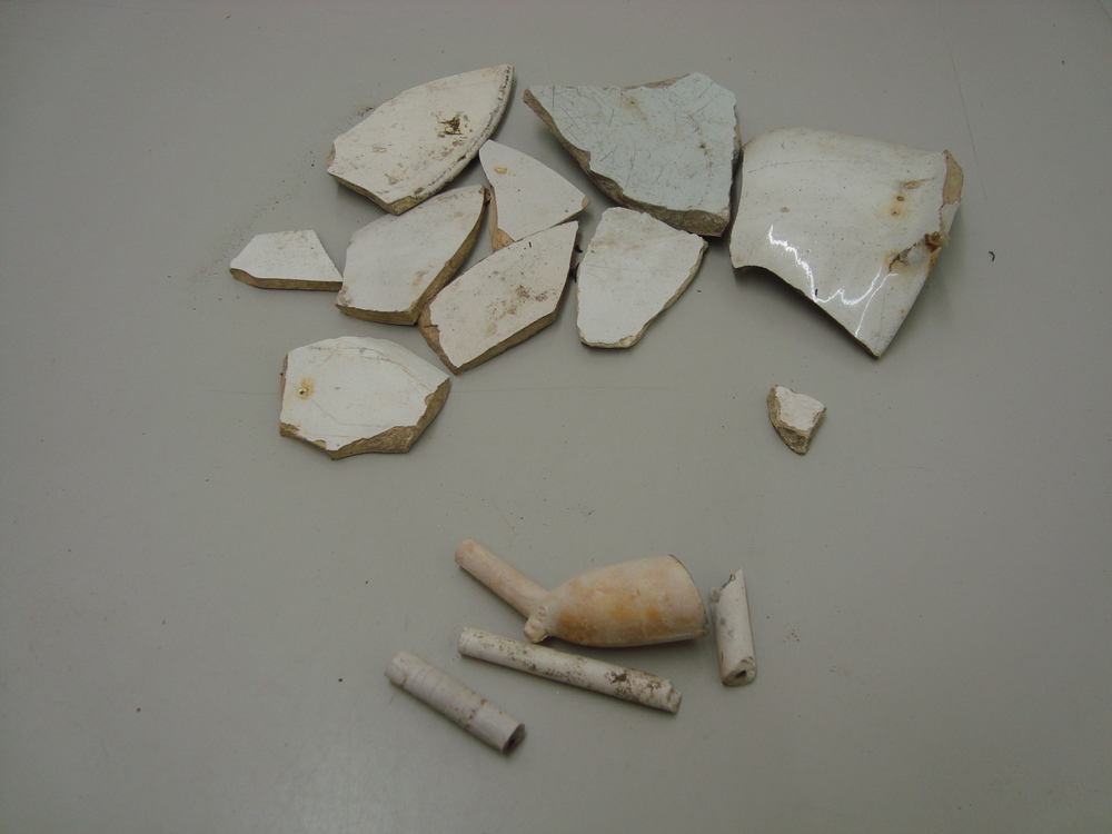 Fragmenten, majolica/aardewerk/leer/pijpaarde,