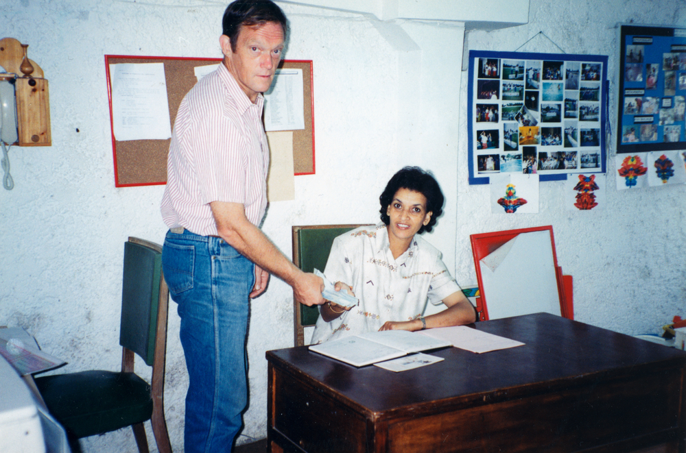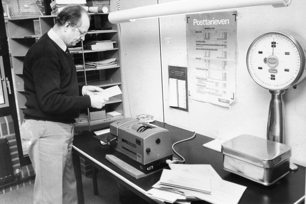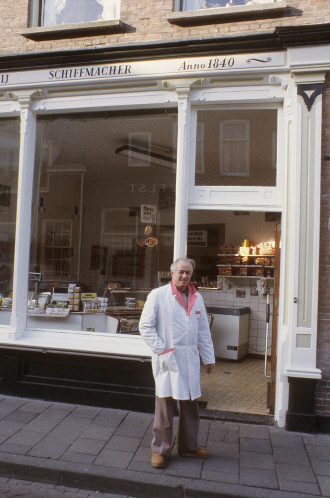 Henk Schiffmacher sr. voor zijn winkel in de Lutteke...