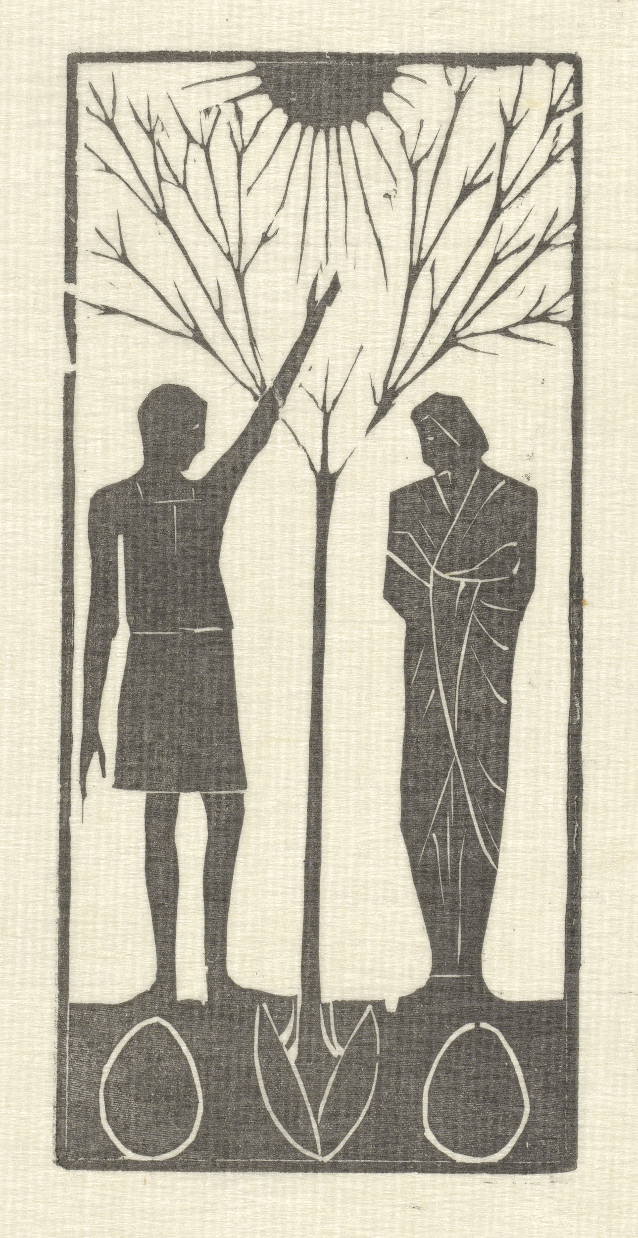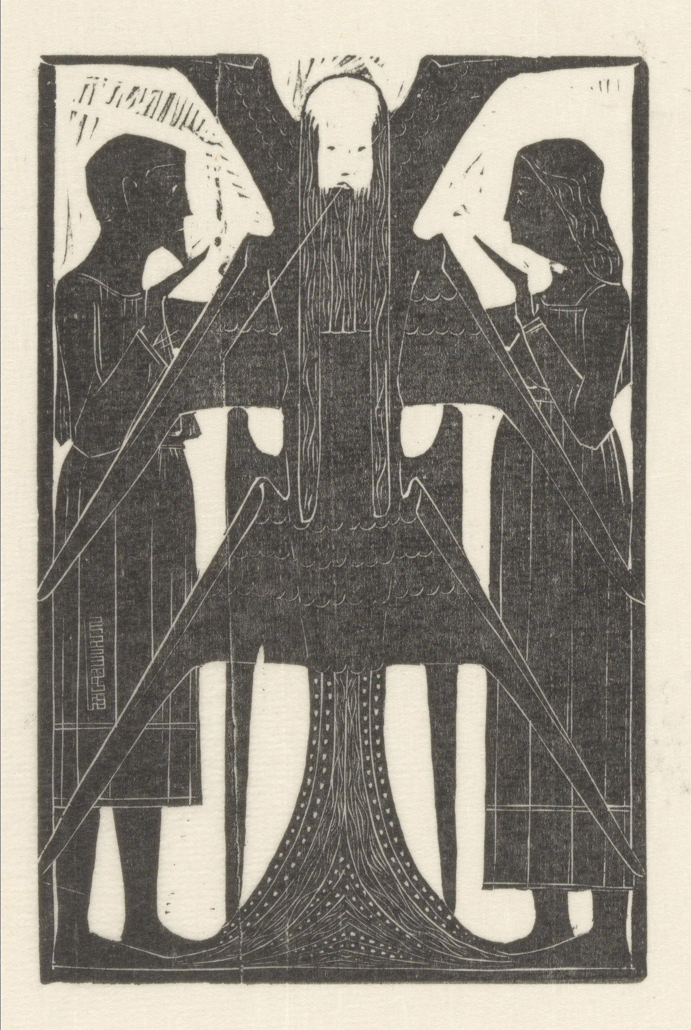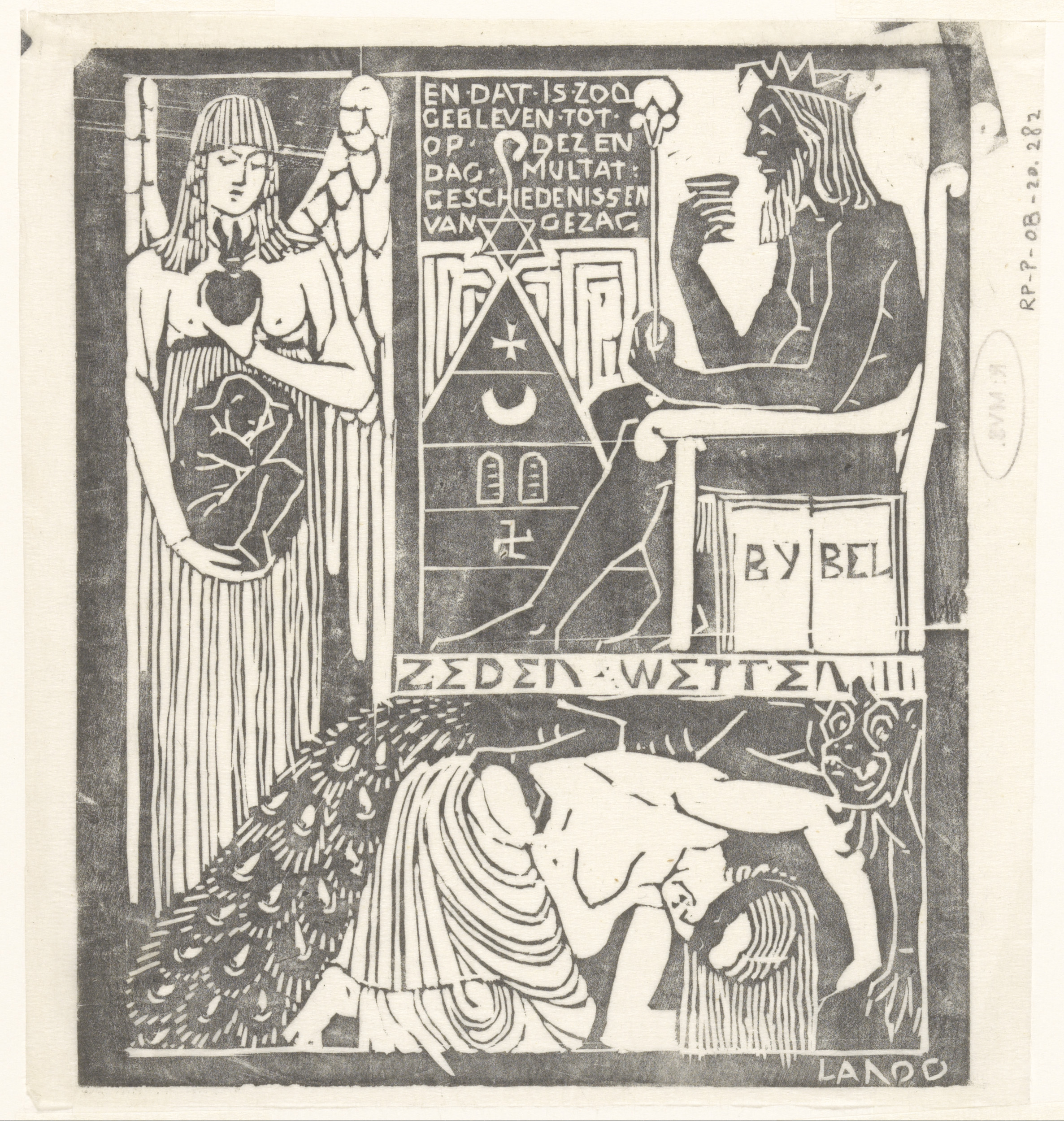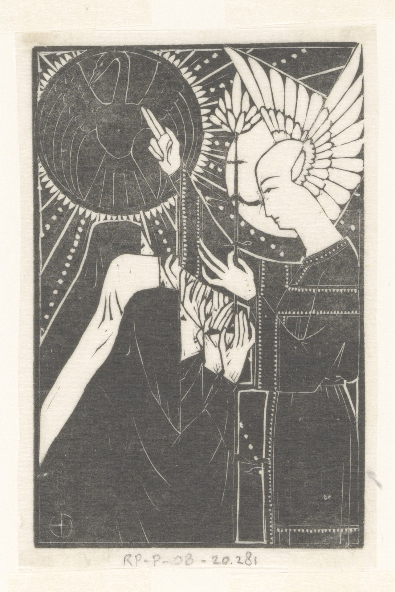 Man en vrouw aan weerszijden van een gevleugelde figuur