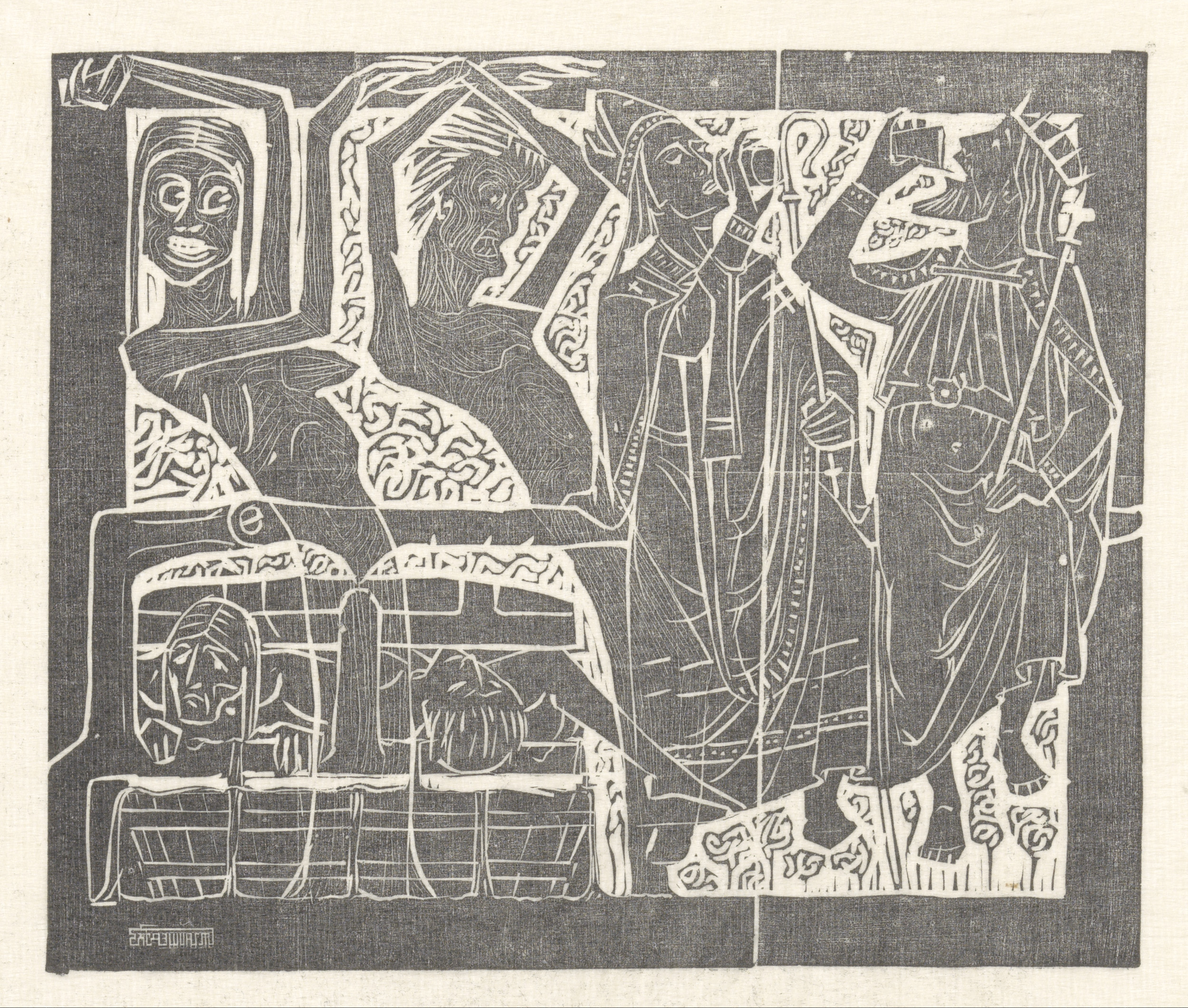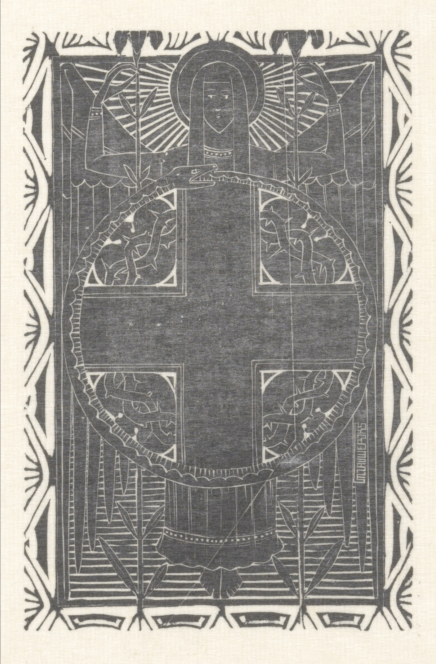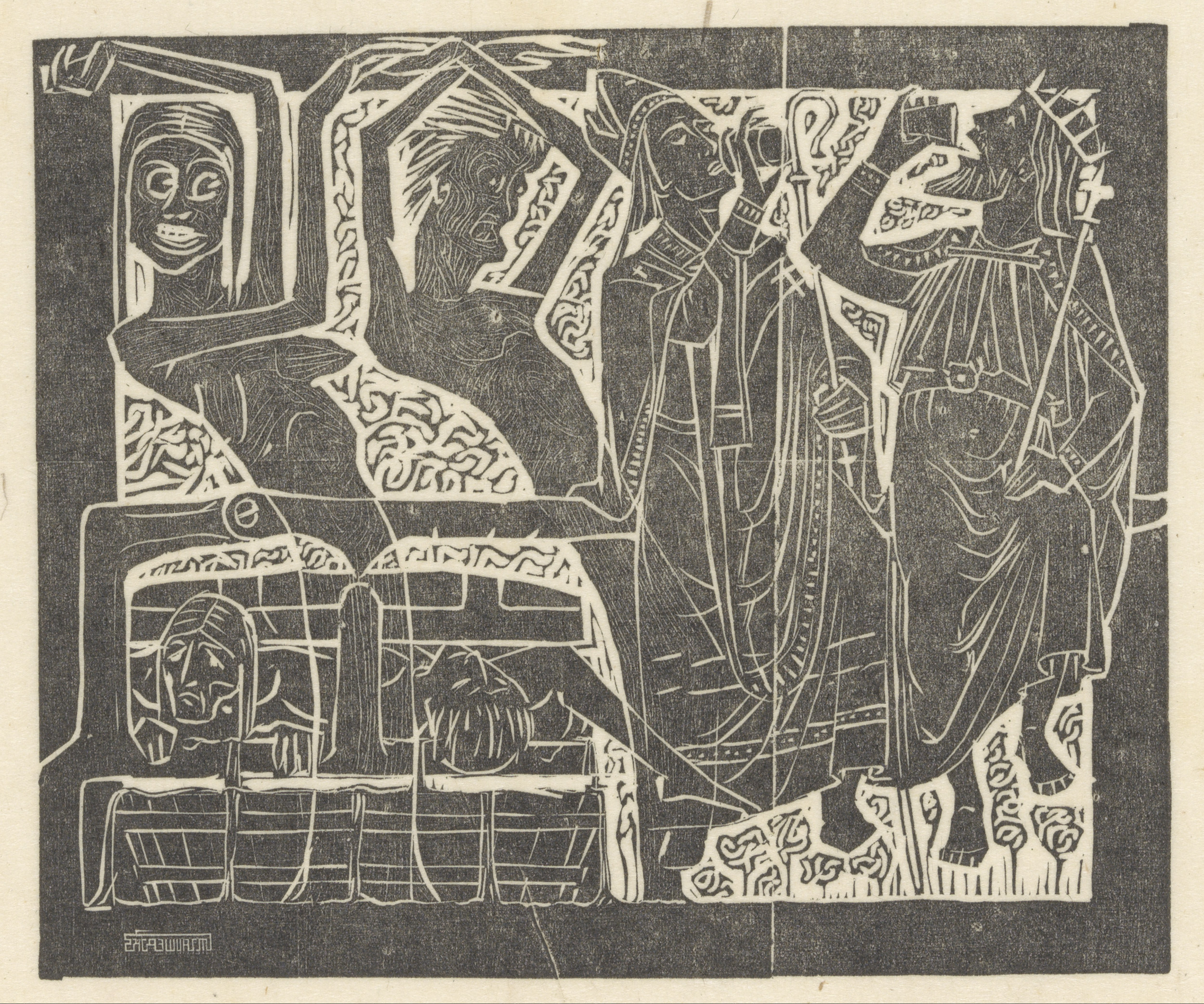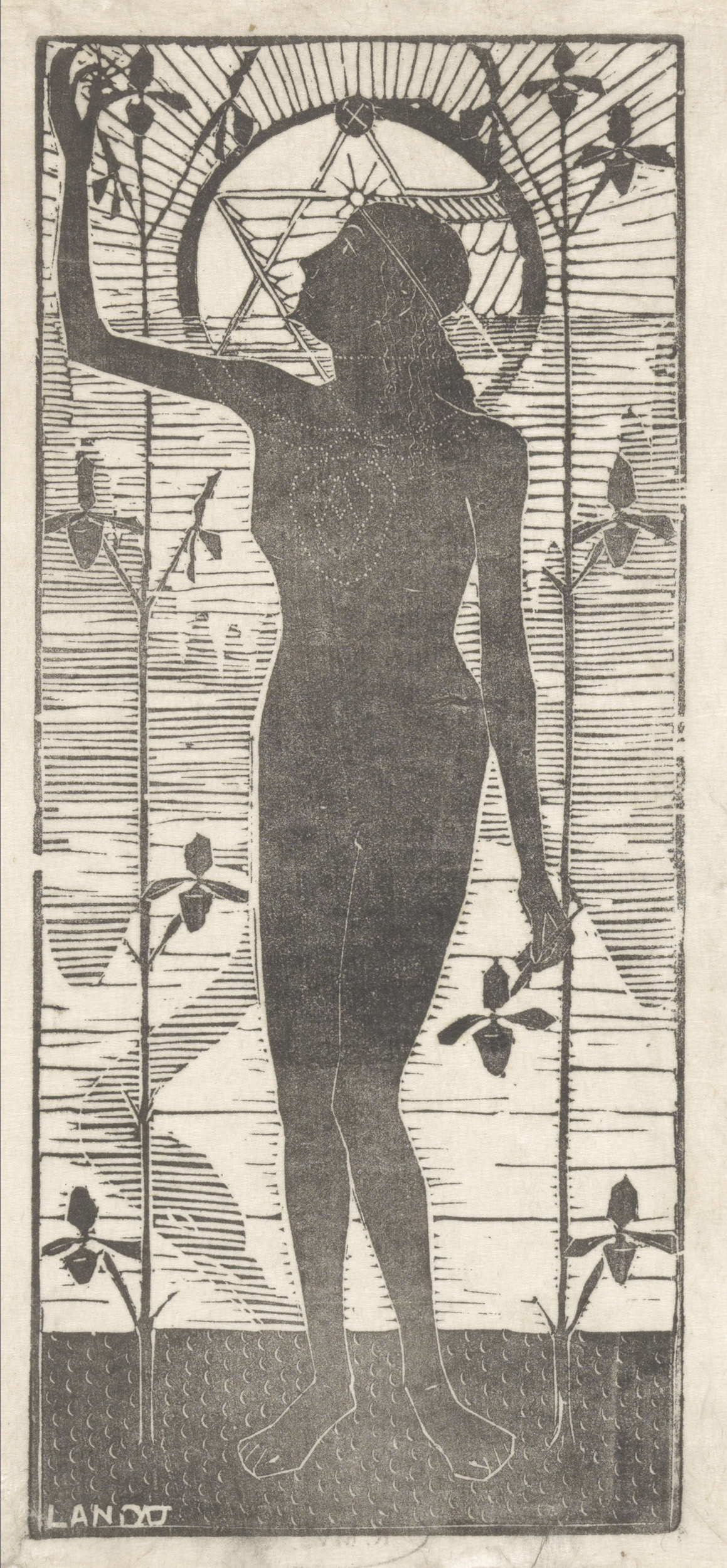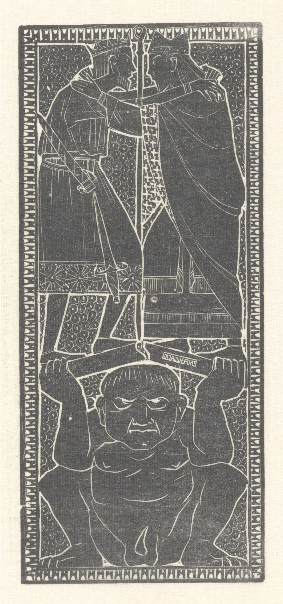Man en vrouw aan weerszijden van een gevleugelde figuur