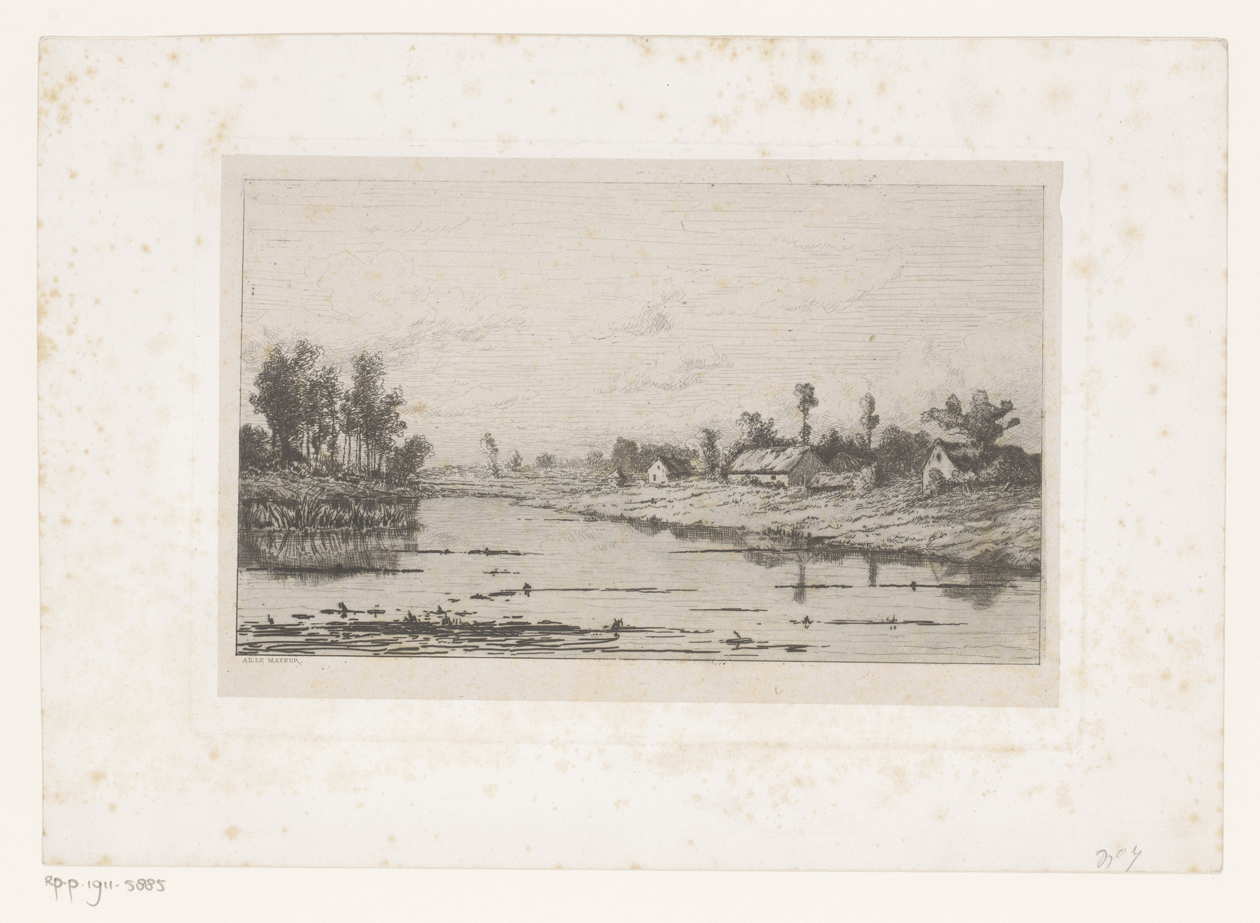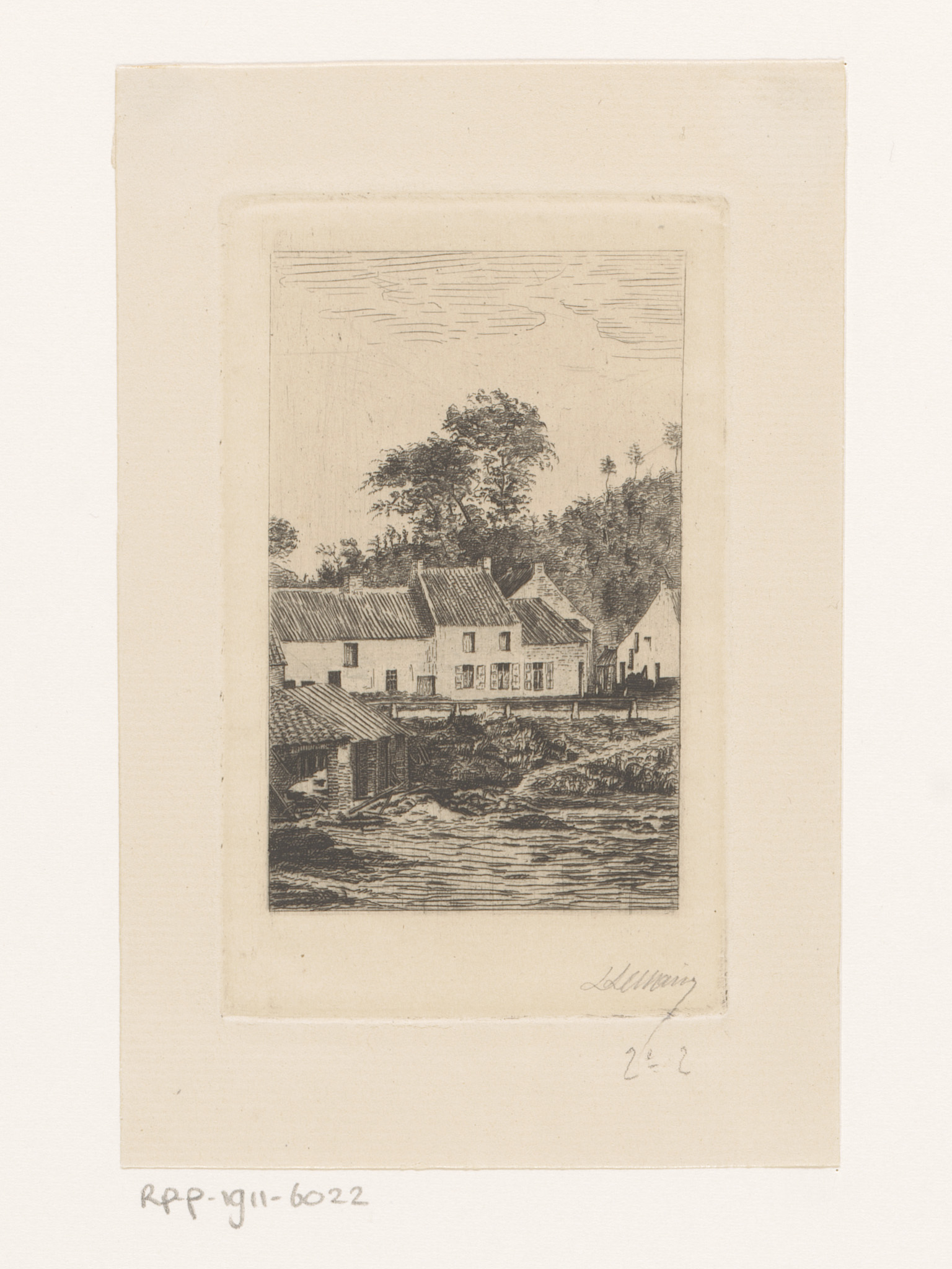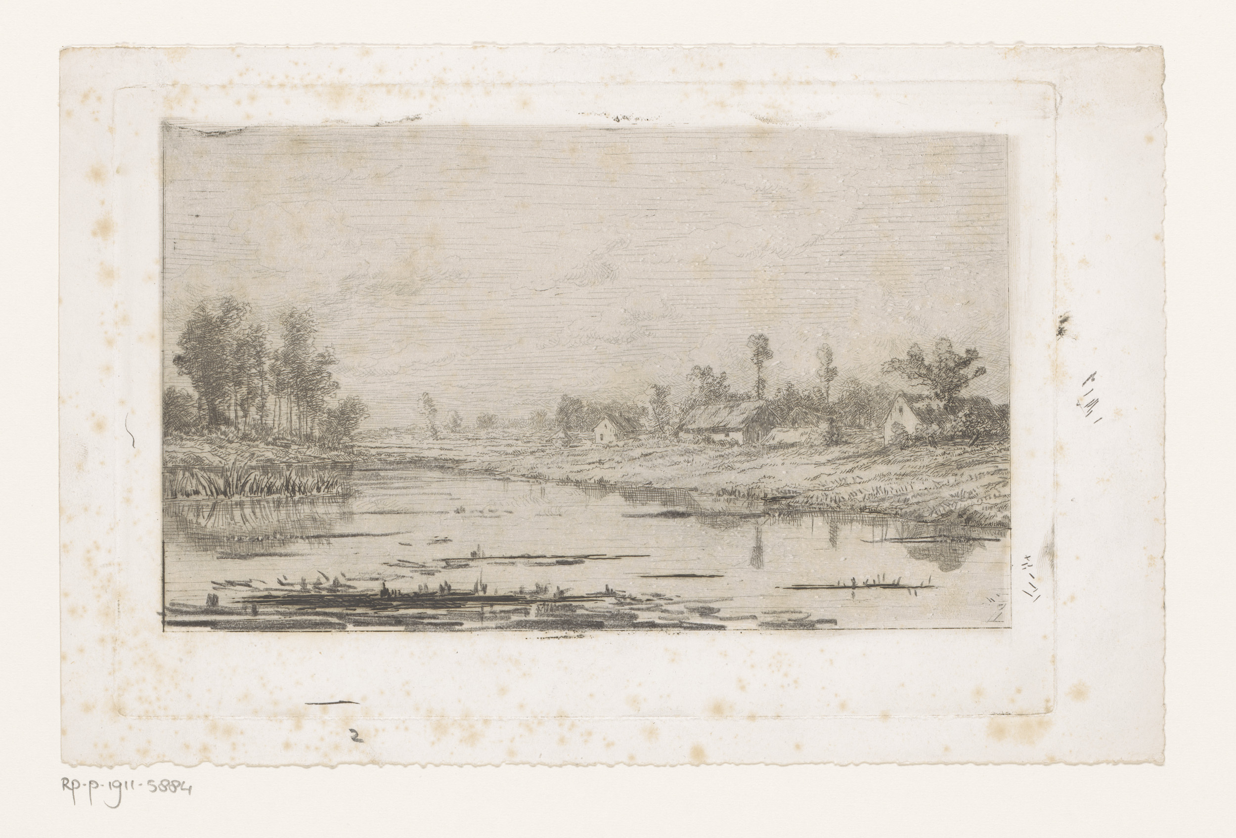 Rivierlandschap met enkele gebouwen