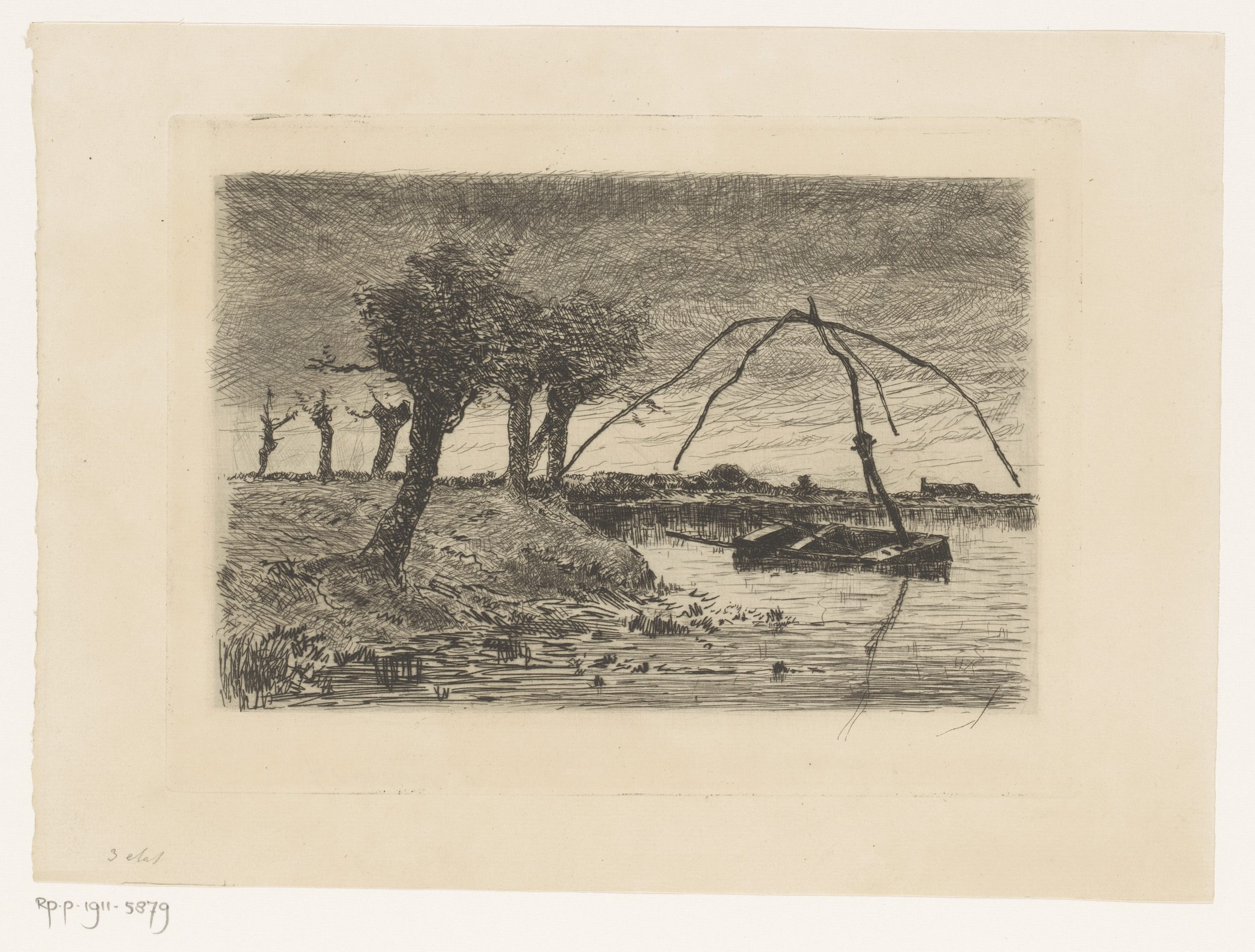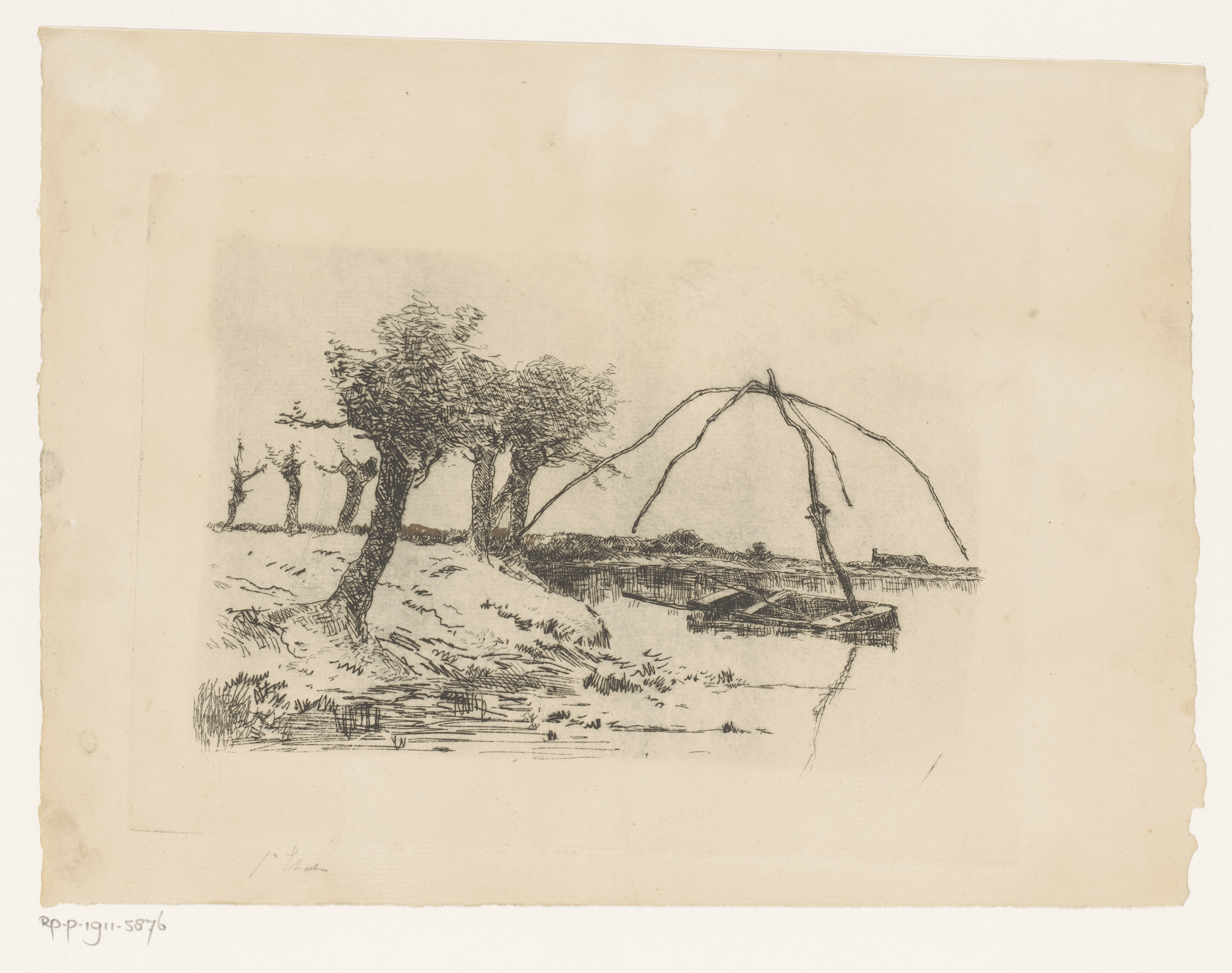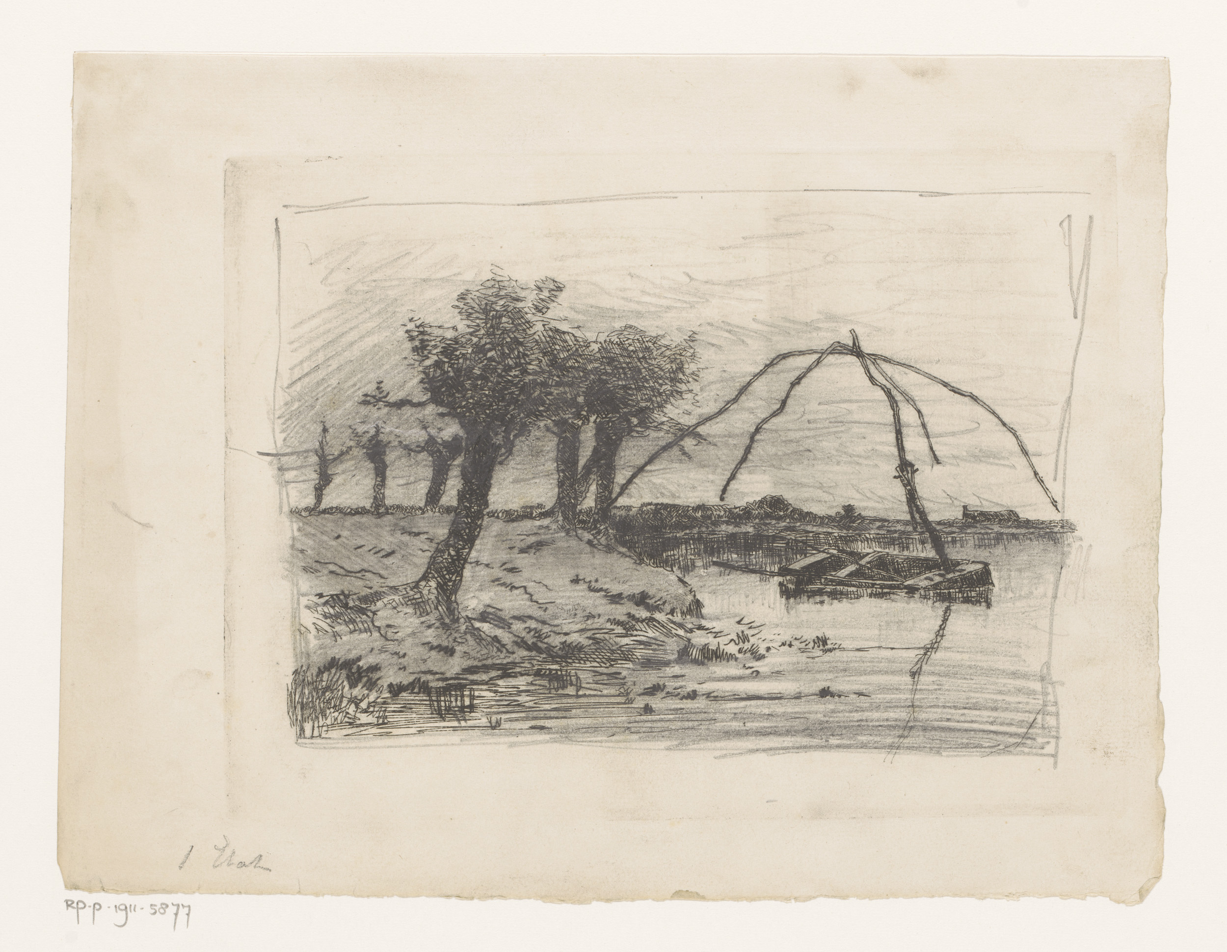 Landschap met knotwilgen, in het water een roeiboot ...