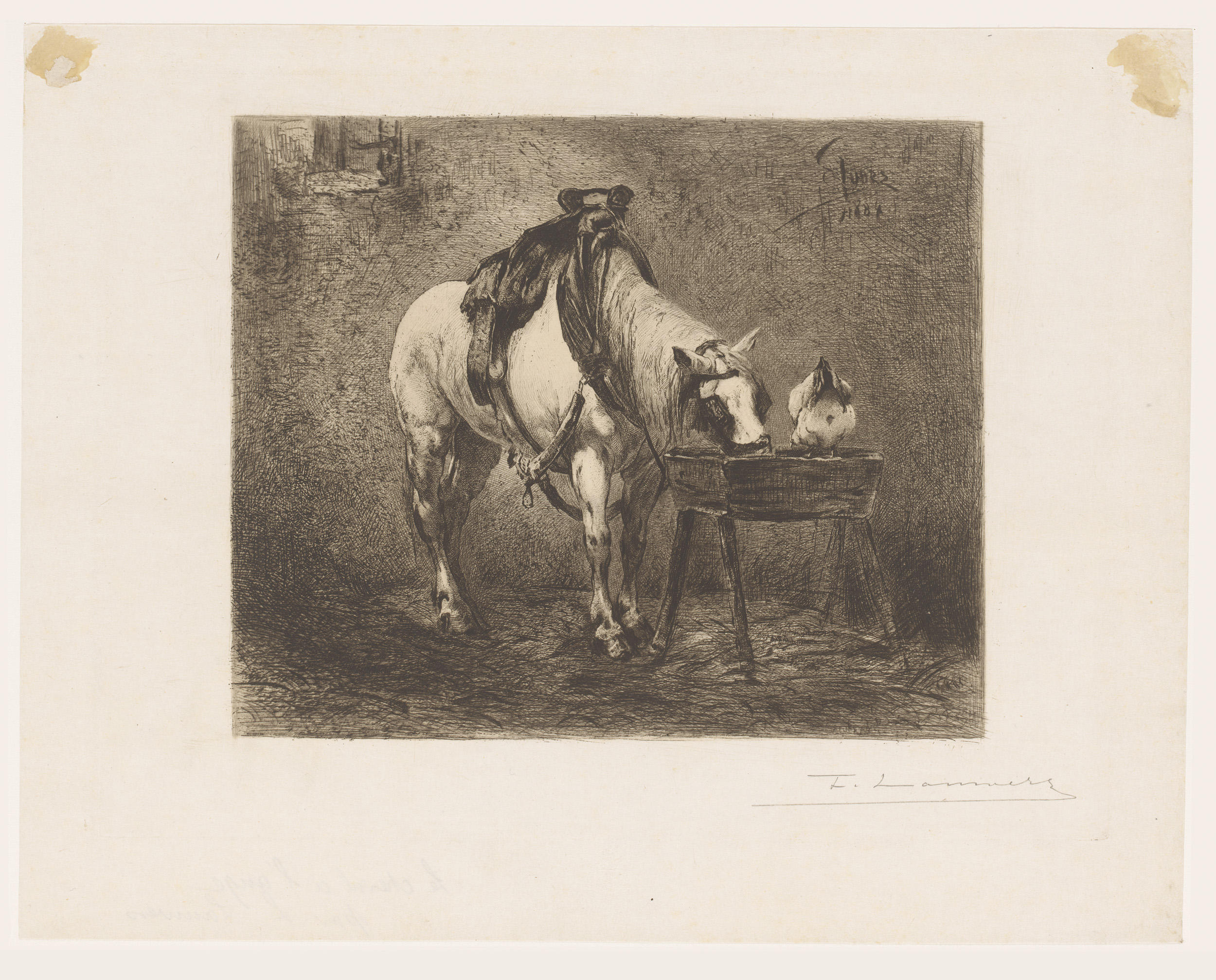 Paard en een kip bij een voerbak