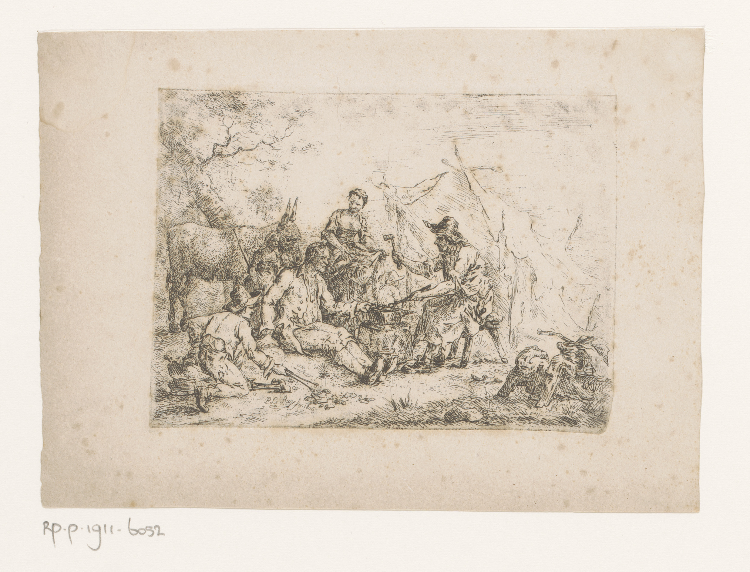 Groep personen en een ezel rond een aambeeld buiten ...