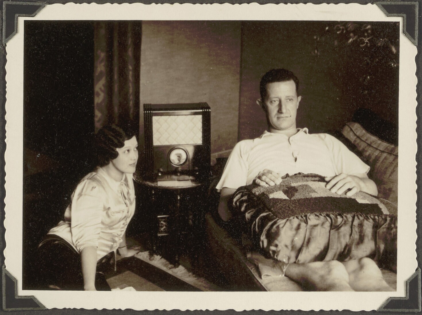 Een vrouw en een man die naar de radio luisteren op ...
