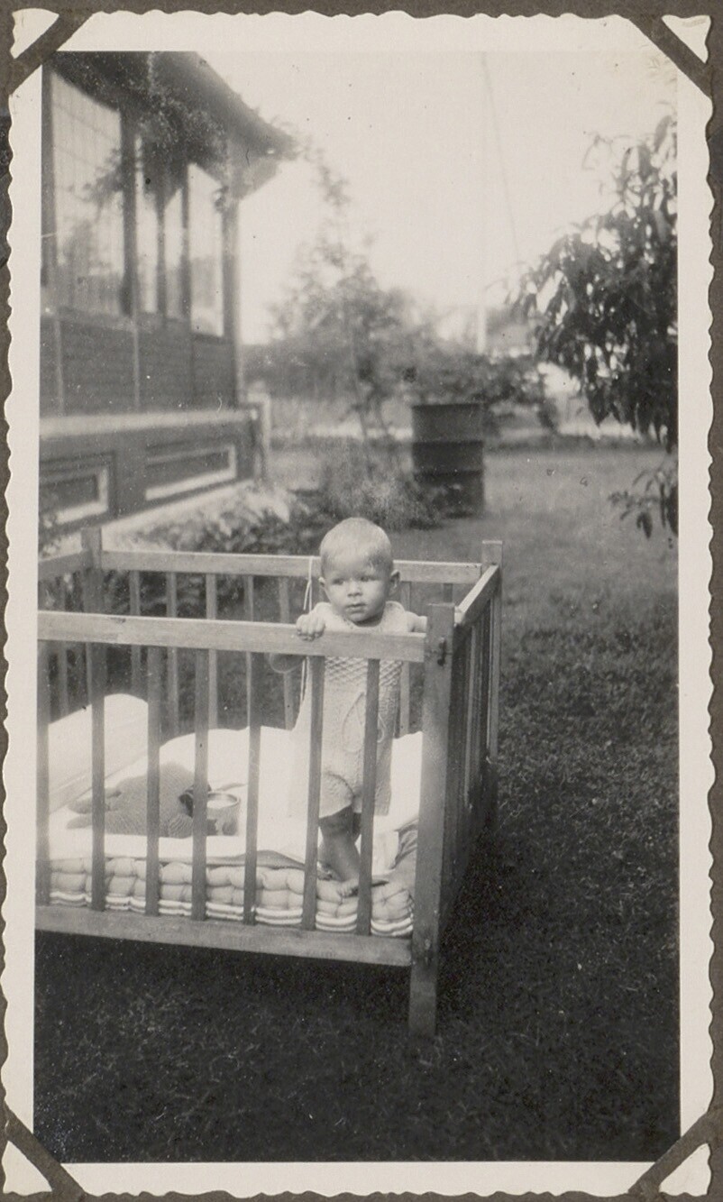 Portret van een baby in een box in een tuin in Indon...