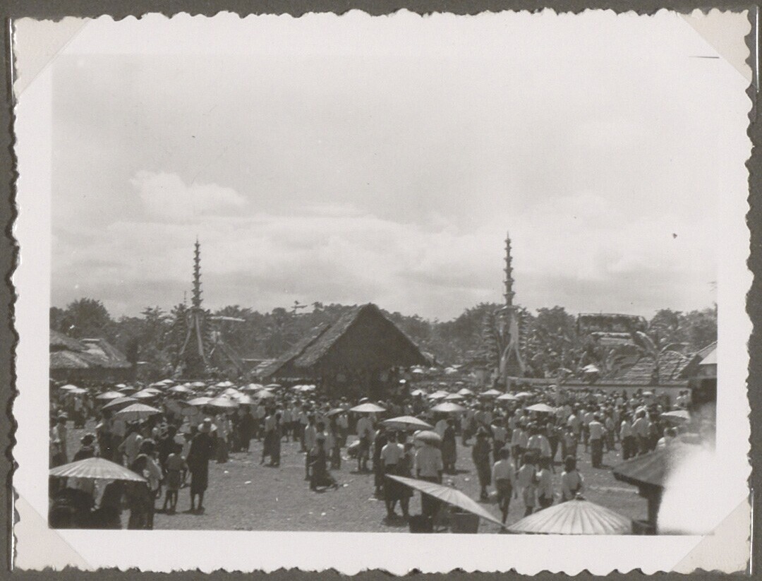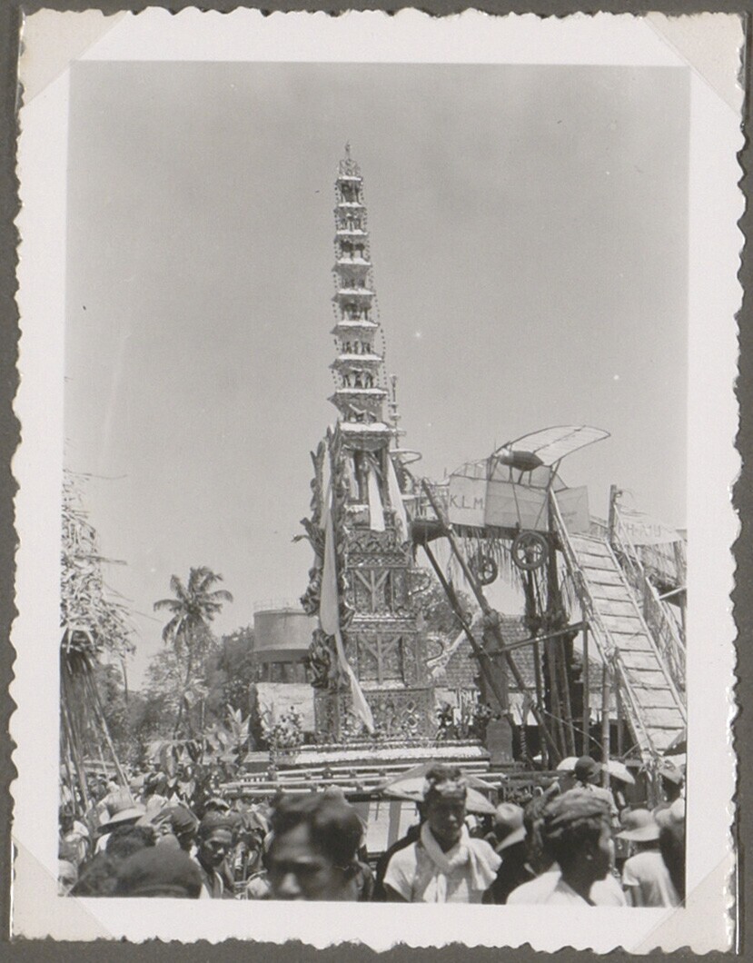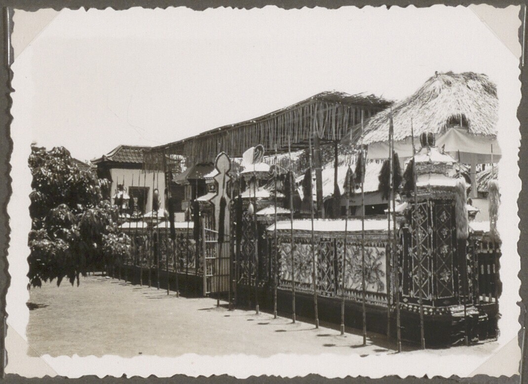 Huis met lijkkisten tijdens een lijkverbranding op Bali