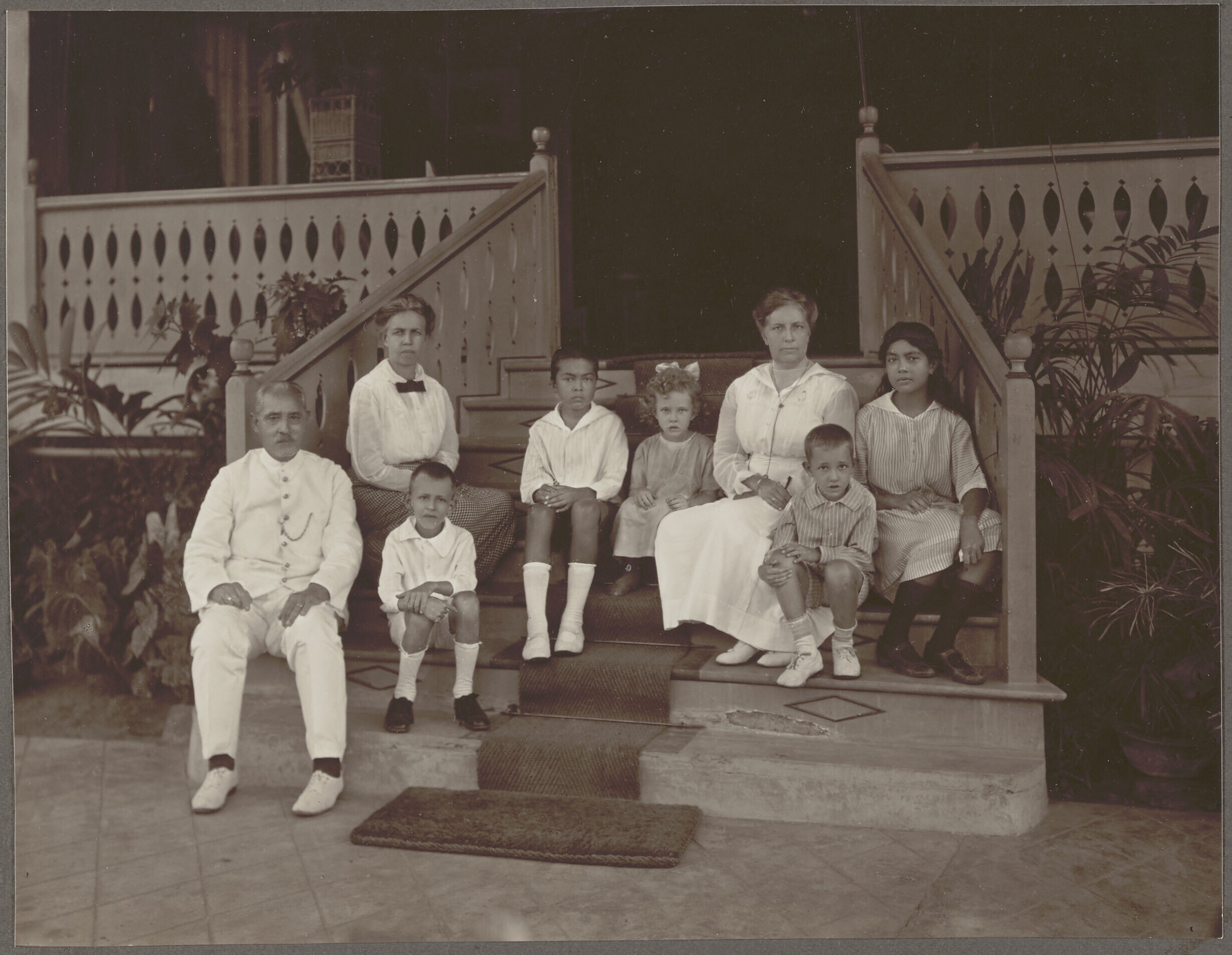 Gezelschap zittend op de trap van een woning
