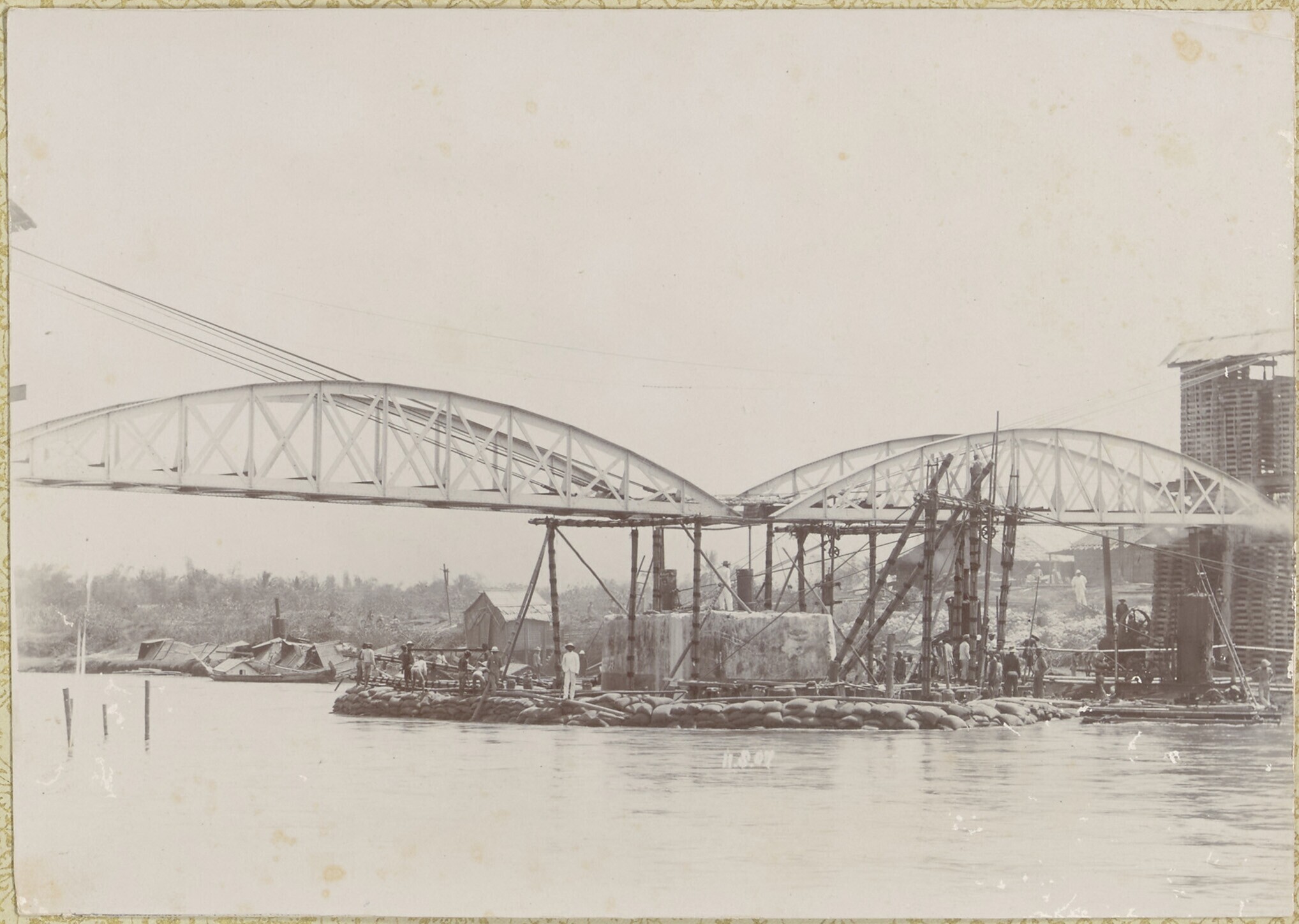 Spoorbrug in aanbouw over de rivier bij Tjisomang