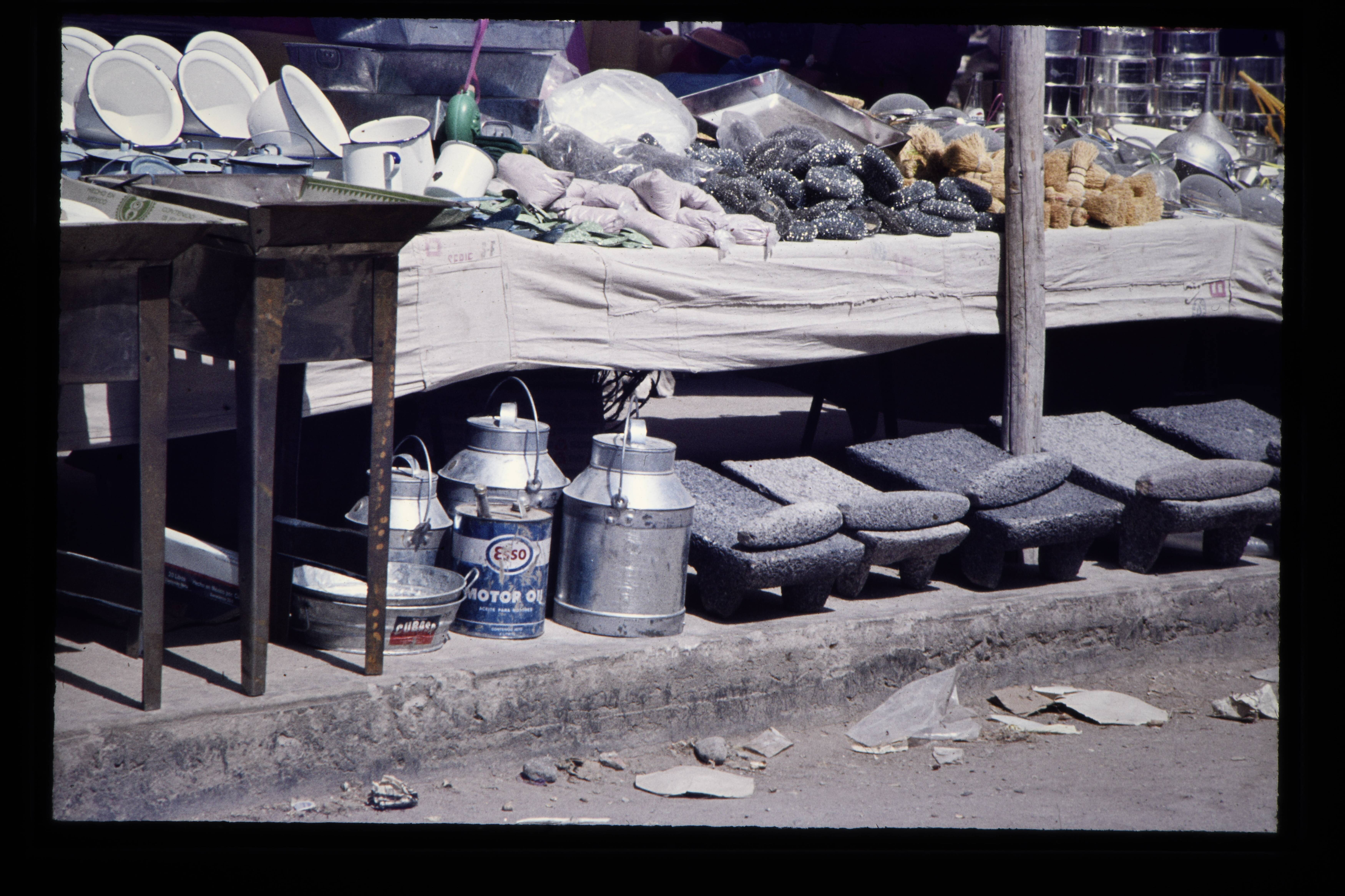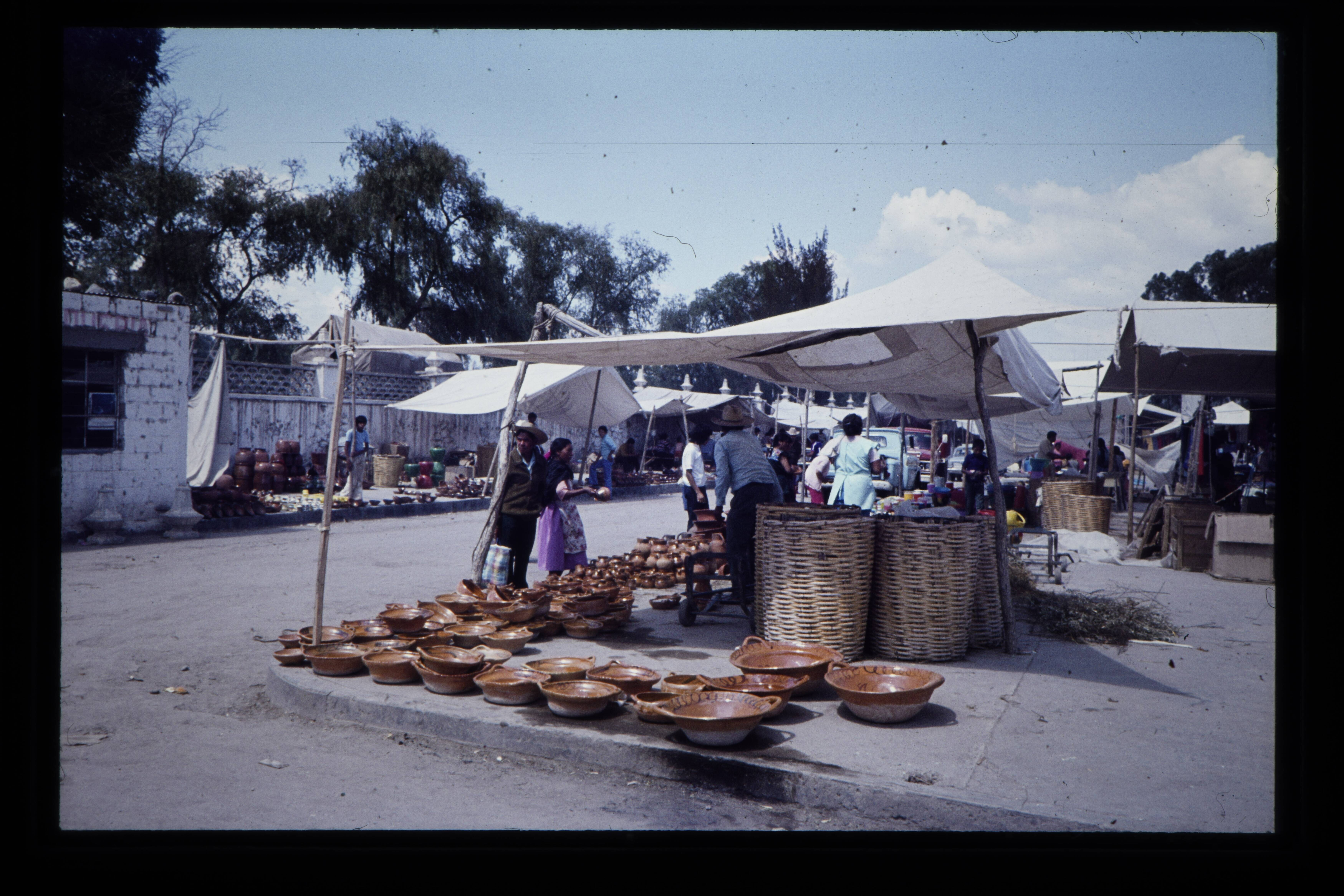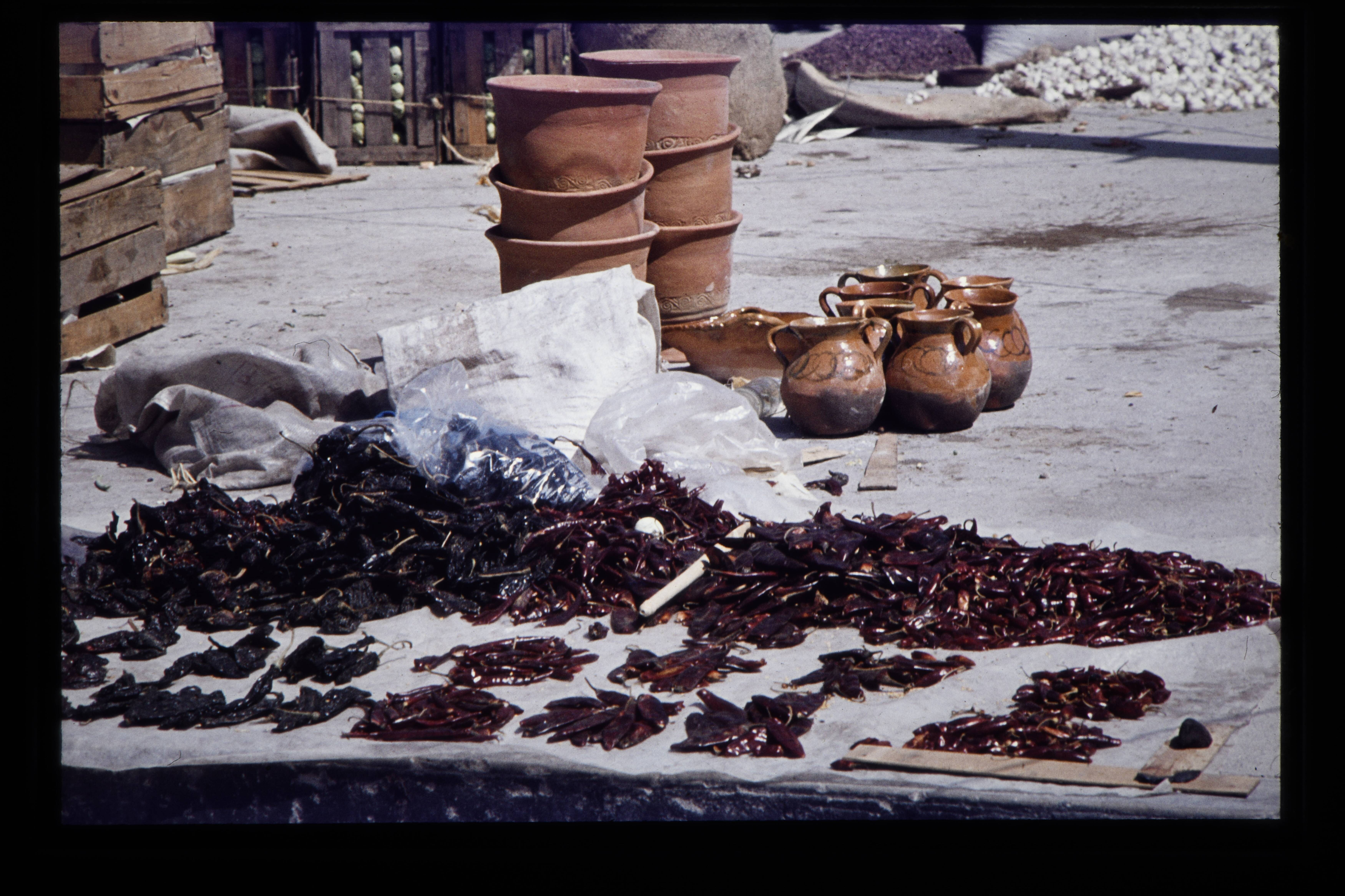 'Verkoop van chilipepers en aardewerk op de markt in...