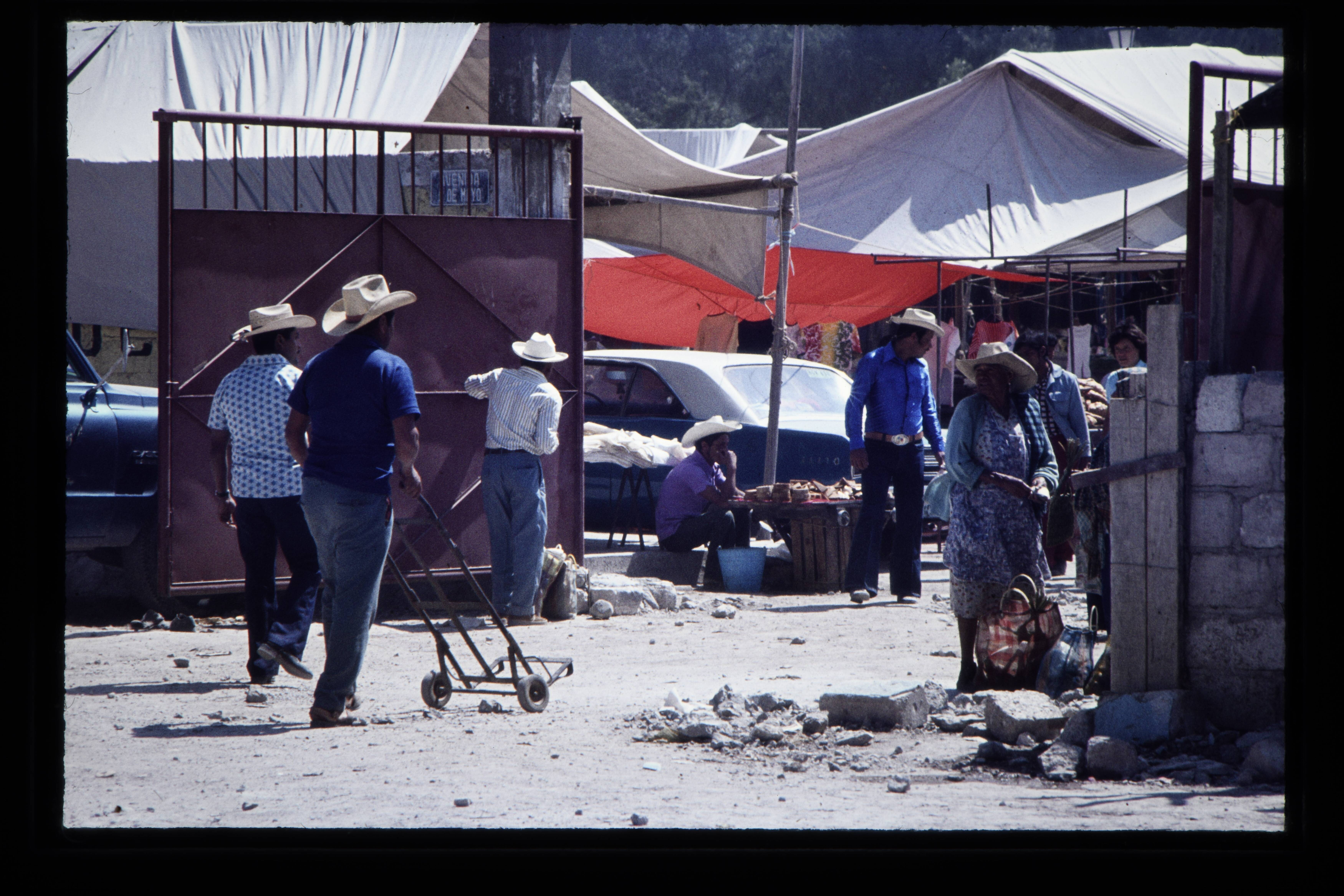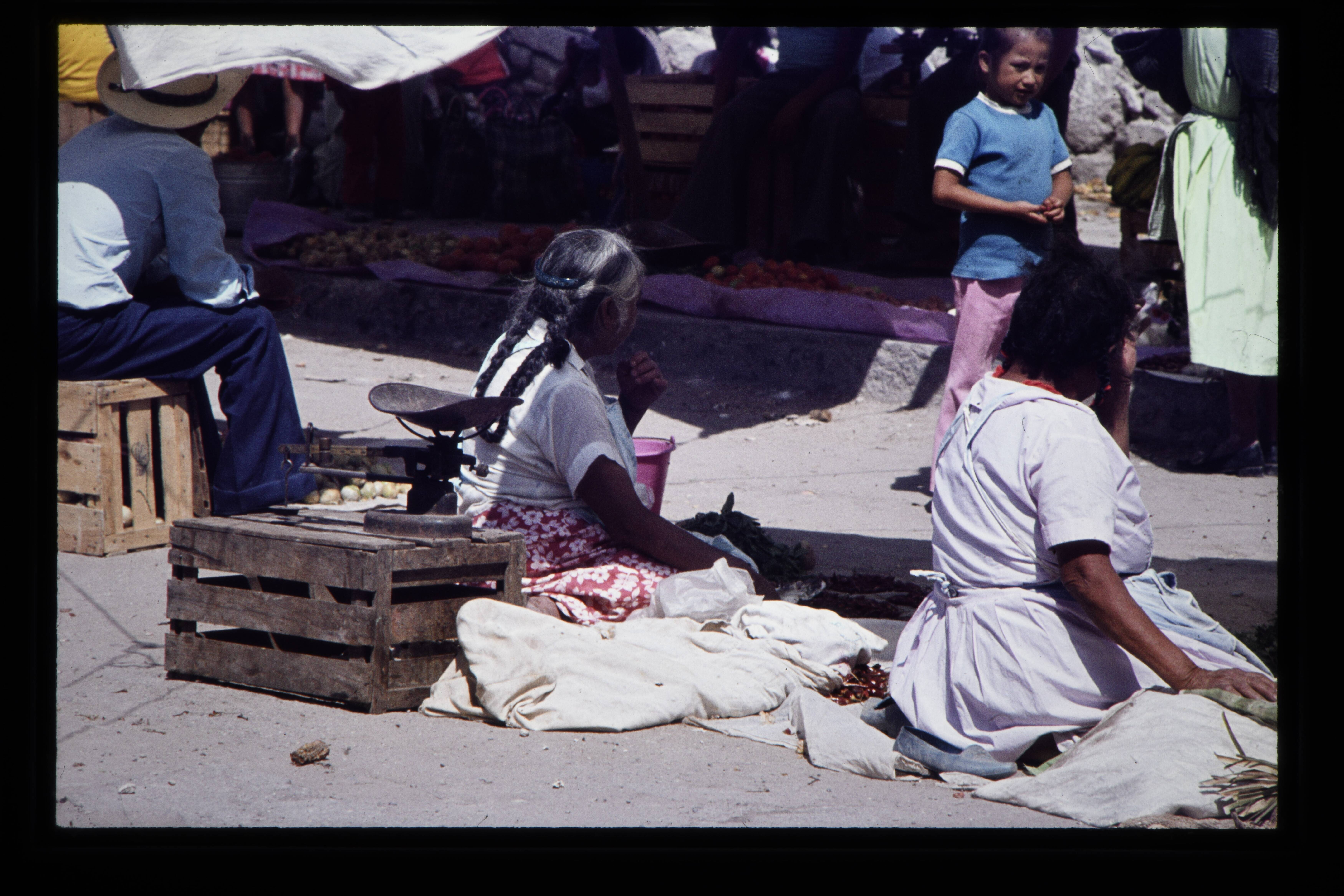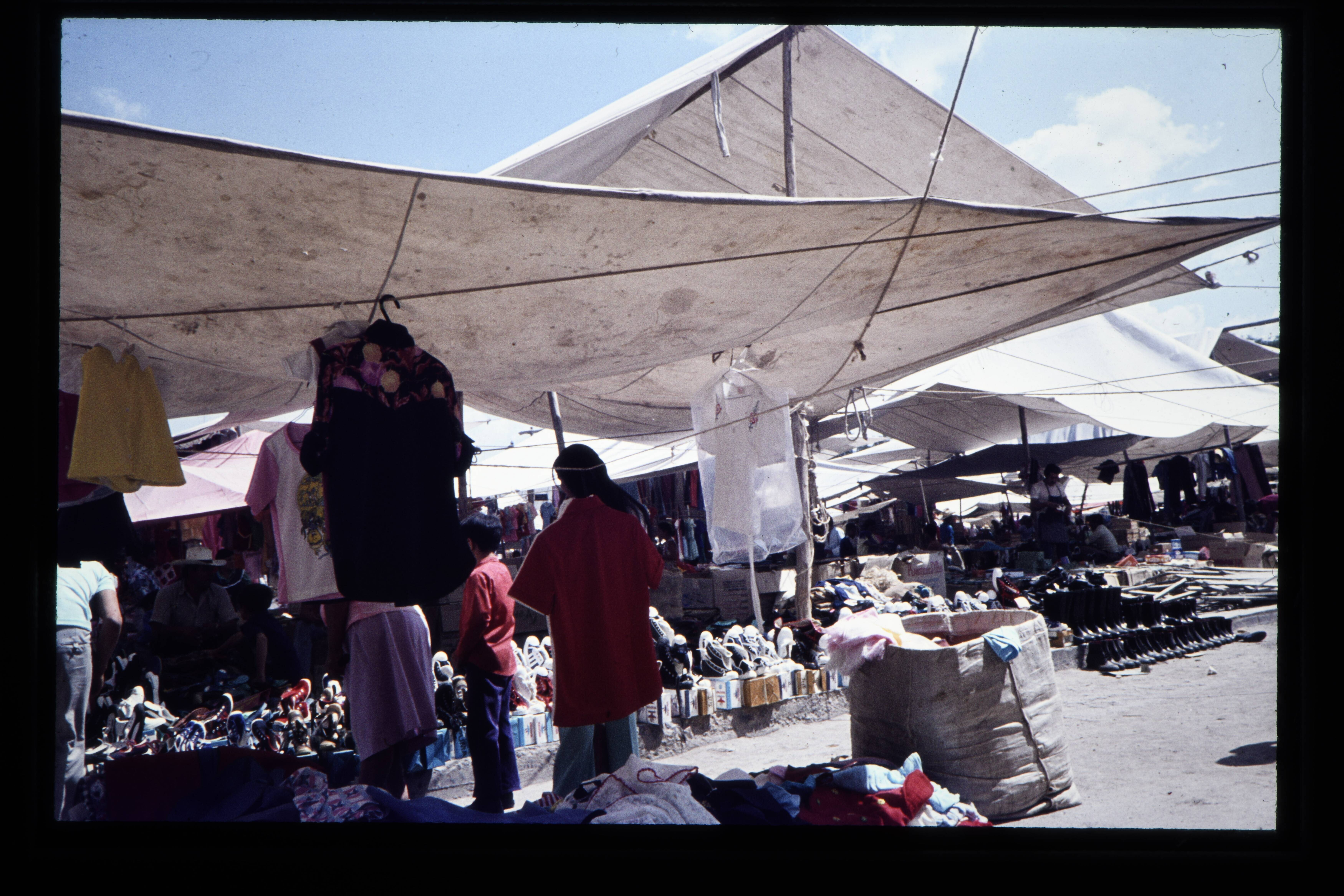 'Verkoop van chilipepers en aardewerk op de markt in...