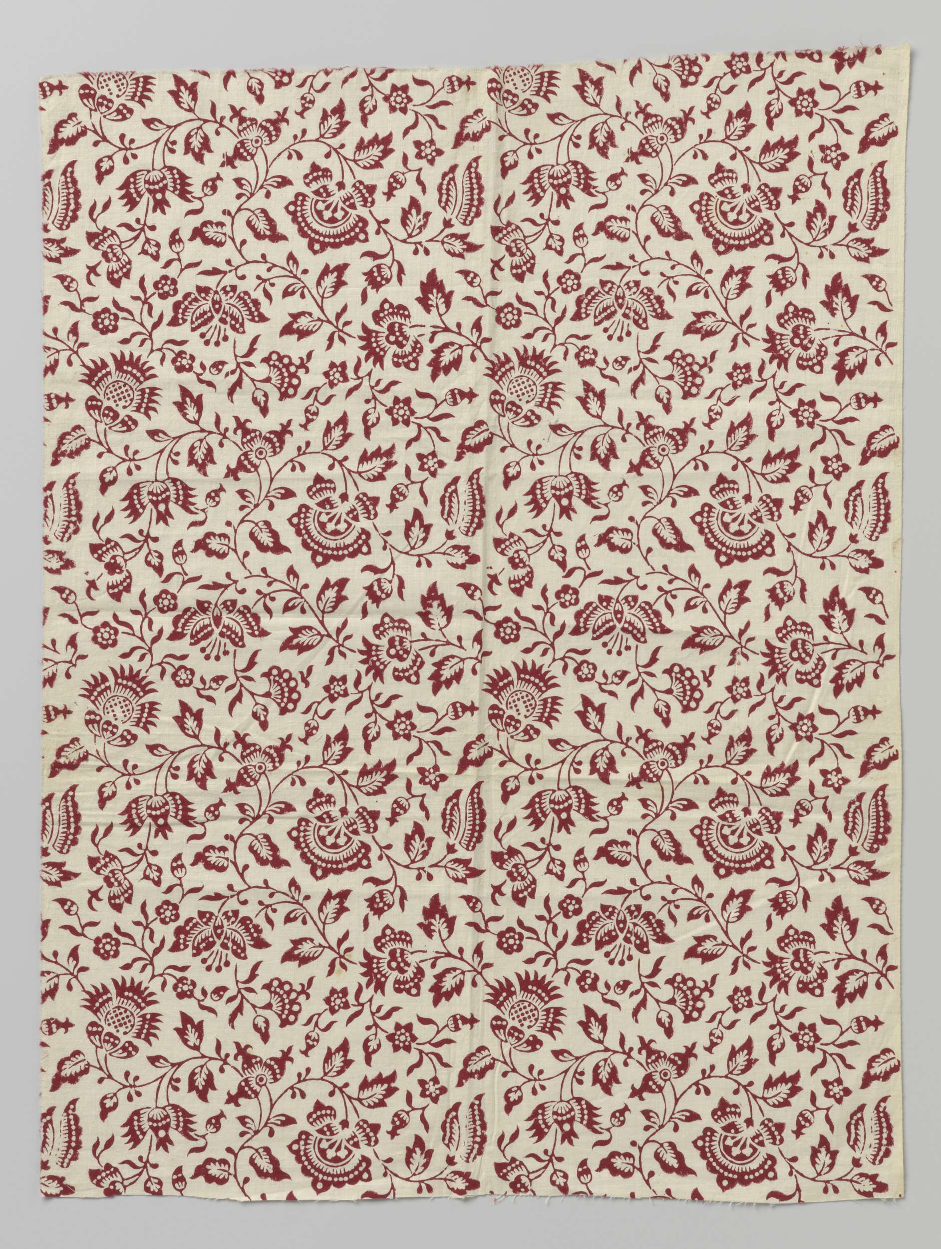 Fragment katoen in rood bedrukt met een asymmetrisch...
