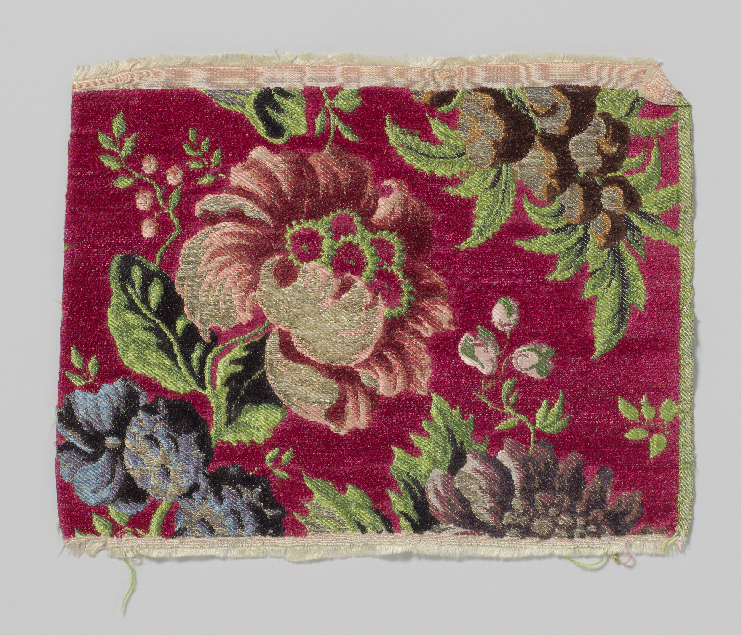 Fragment zijdeweefsel met cérise fond van chenille, ...
