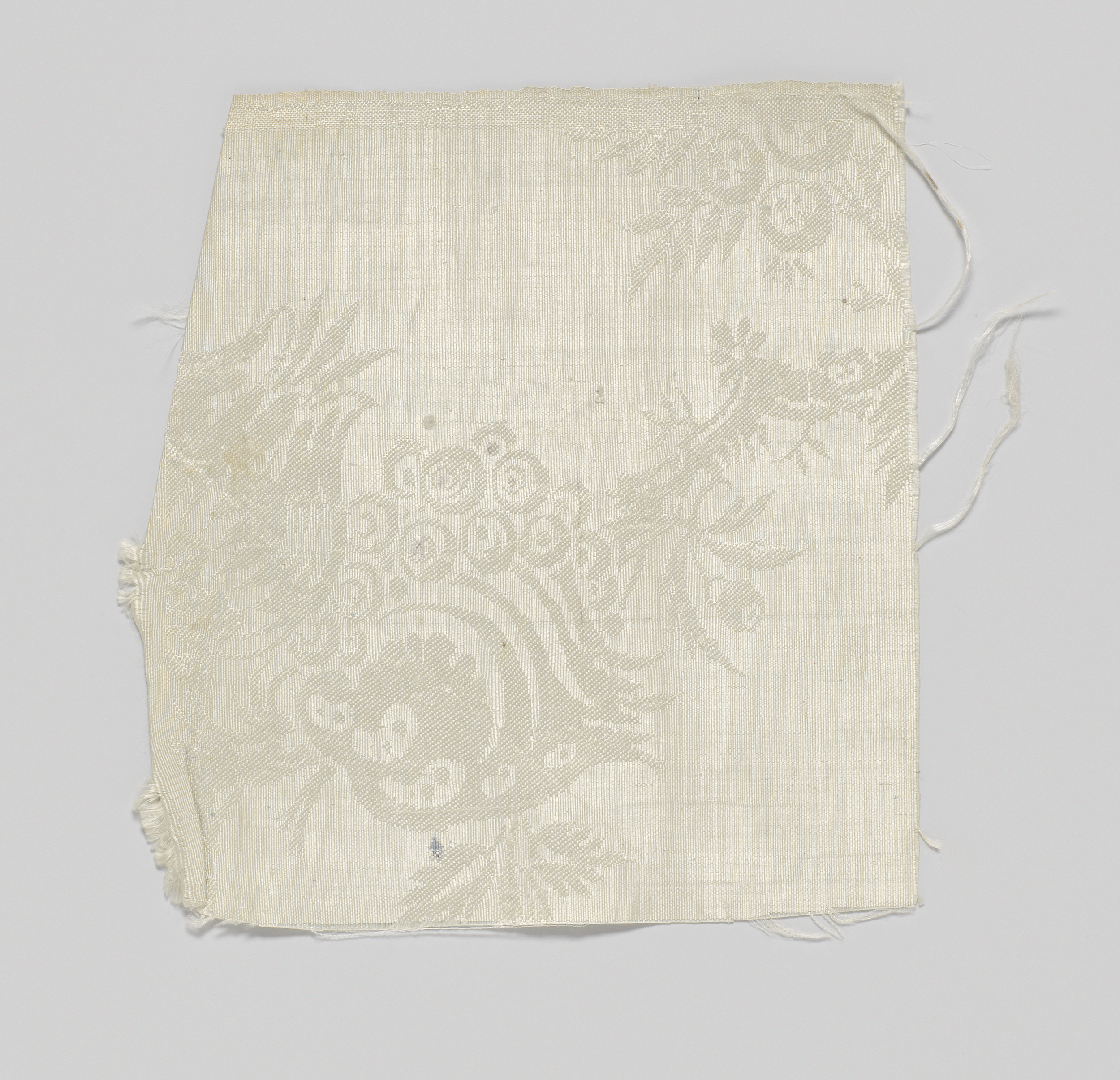 Fragment zijdedamast in wit en zilver met patroon va...