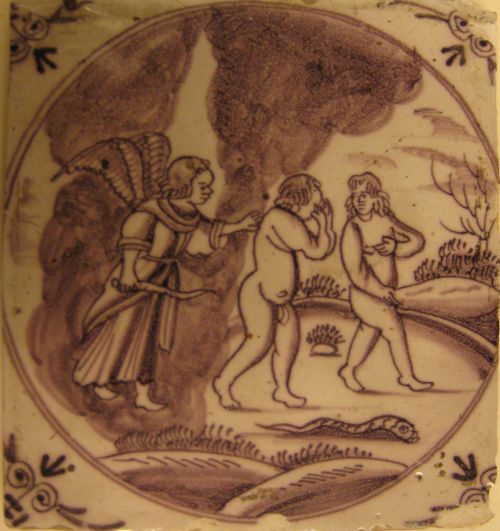 Tegel met 'De verdrijving van Adam en Eva uit het pa...