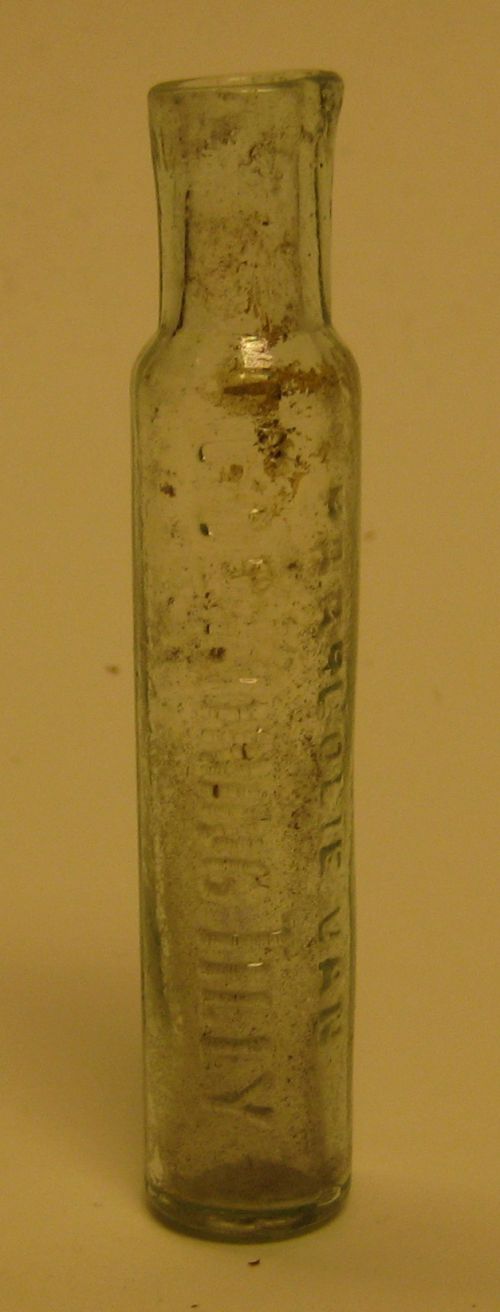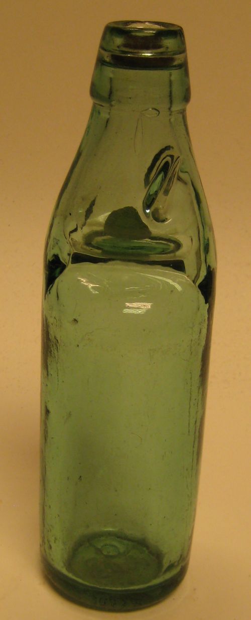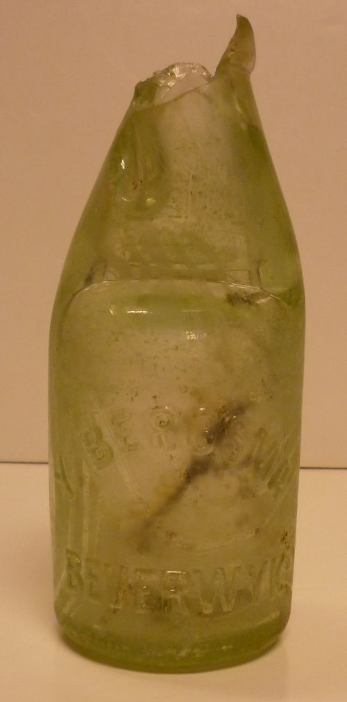 Kogelfles met opschrift: "Y. Bergsma Beverwijk"