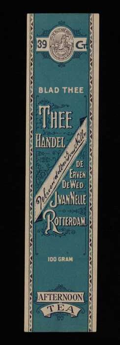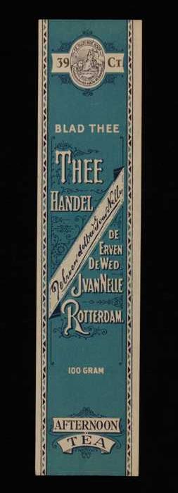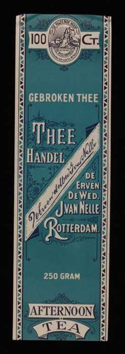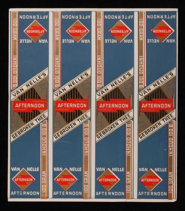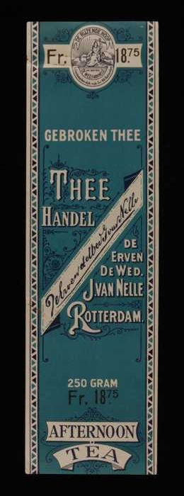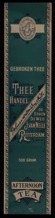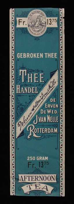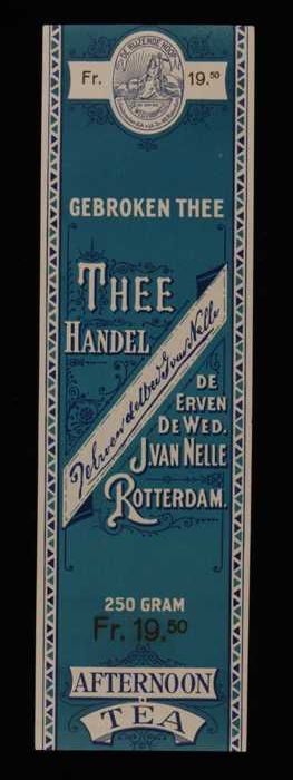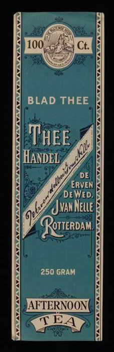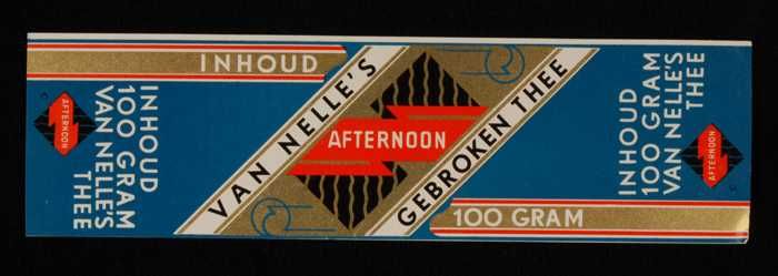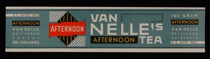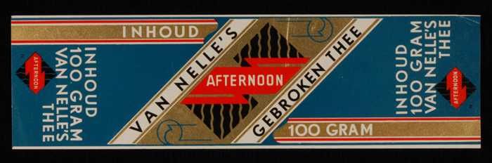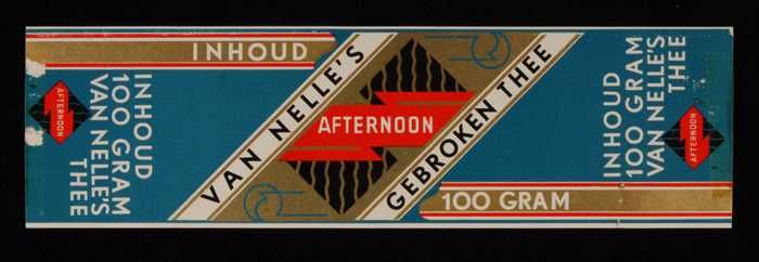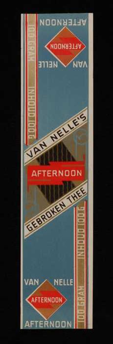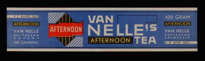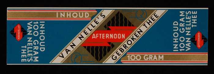 Blauw, papieren label VAN NELLE AFTERNOON THEE, blad...