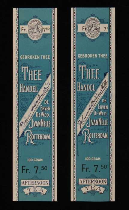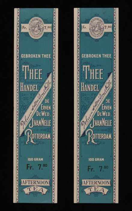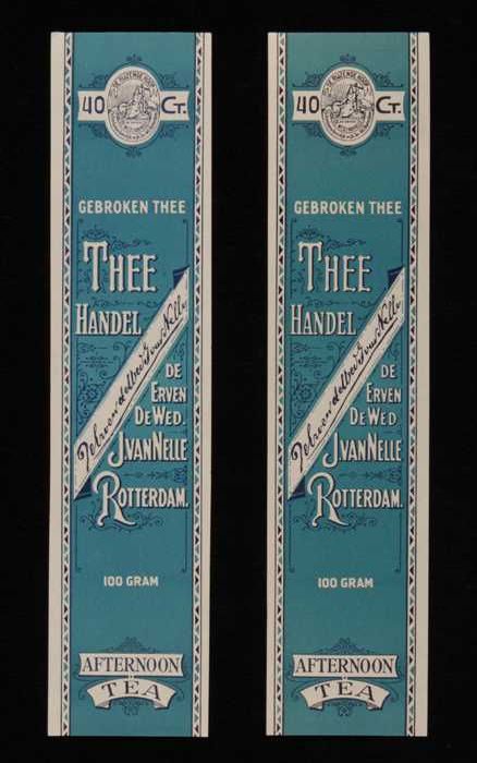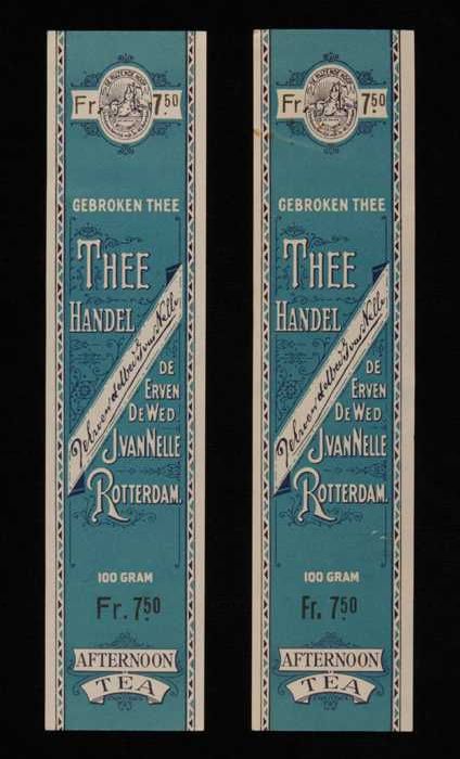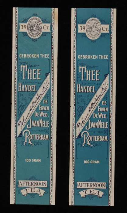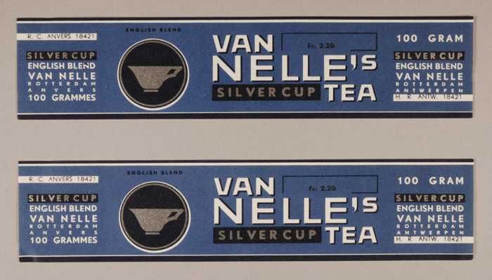 Twee blauwe labels VAN NELLE'S SILVER CUP THEE, Enge...