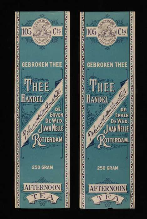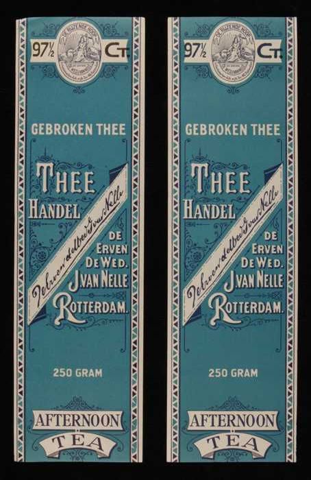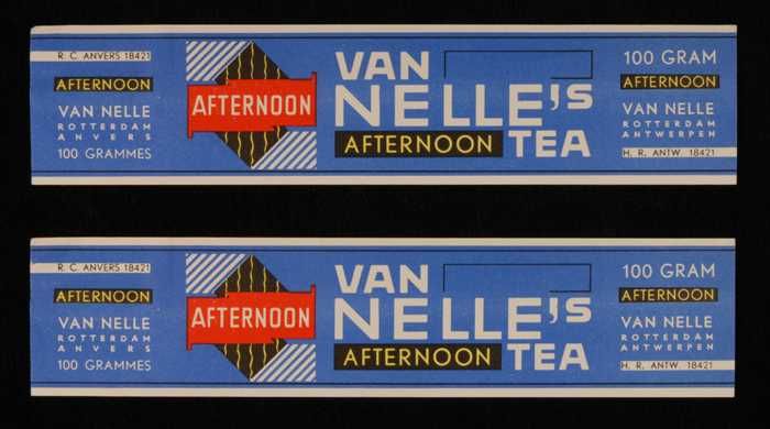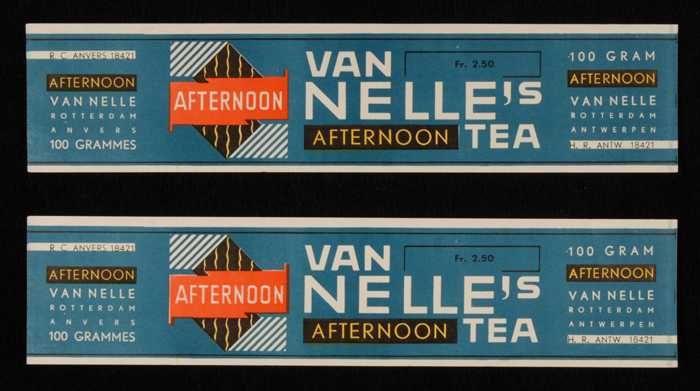 Twee blauw-grijze labels VAN NELLE'S AFTERNOON THEE,...