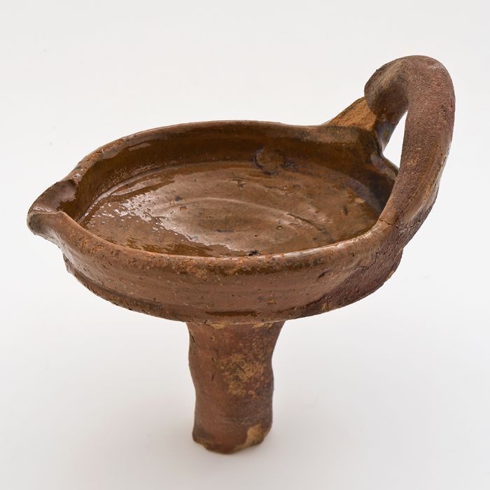 Fragment aardewerk olielamp, schaal met ophangoor en...