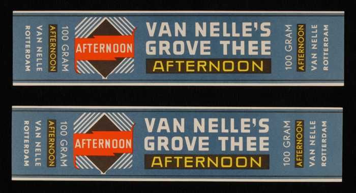 Twee grijs-blauwe labels VAN NELLE AFTERNOON THEE, 1...