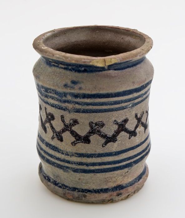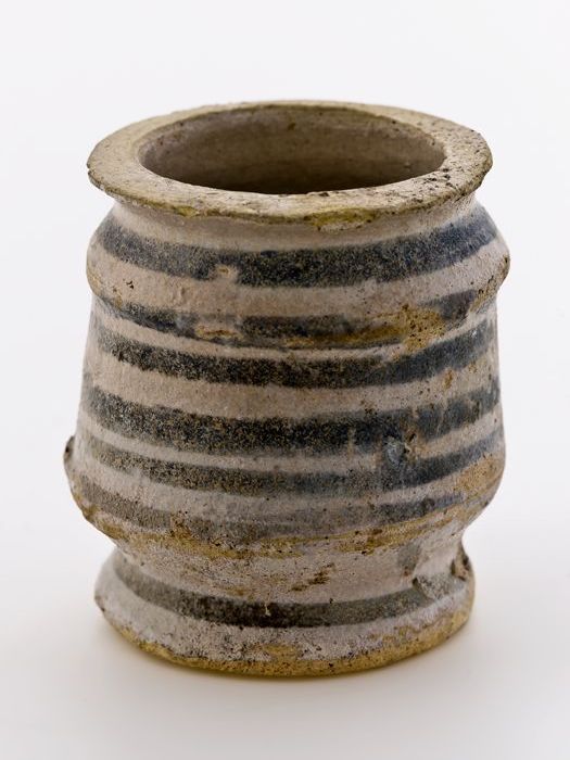 Aardewerk zalfpot, faience met twee insnoeringen, bl...