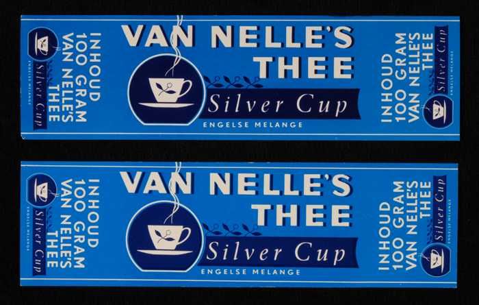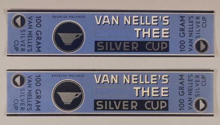 Twee blauw-grijze labels VAN NELLE'S SILVER CUP THEE...