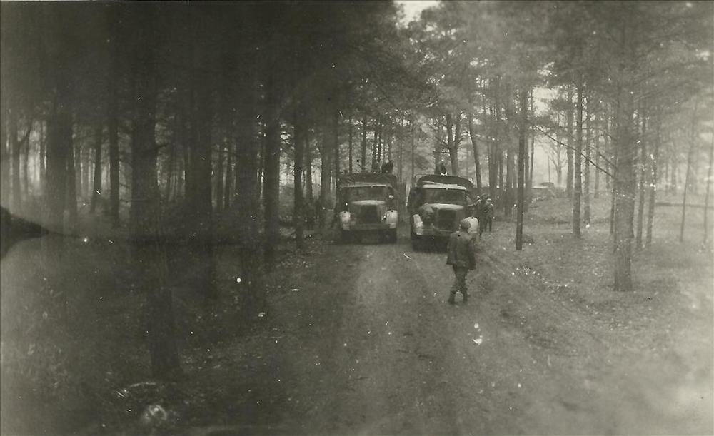 twee Canadese vrachtwagens in bosperceel