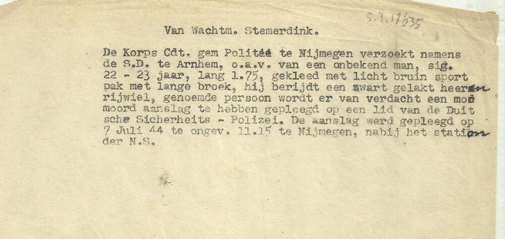 Alarmeringsbericht, 7 juli 1944, betreffende aanhoud...