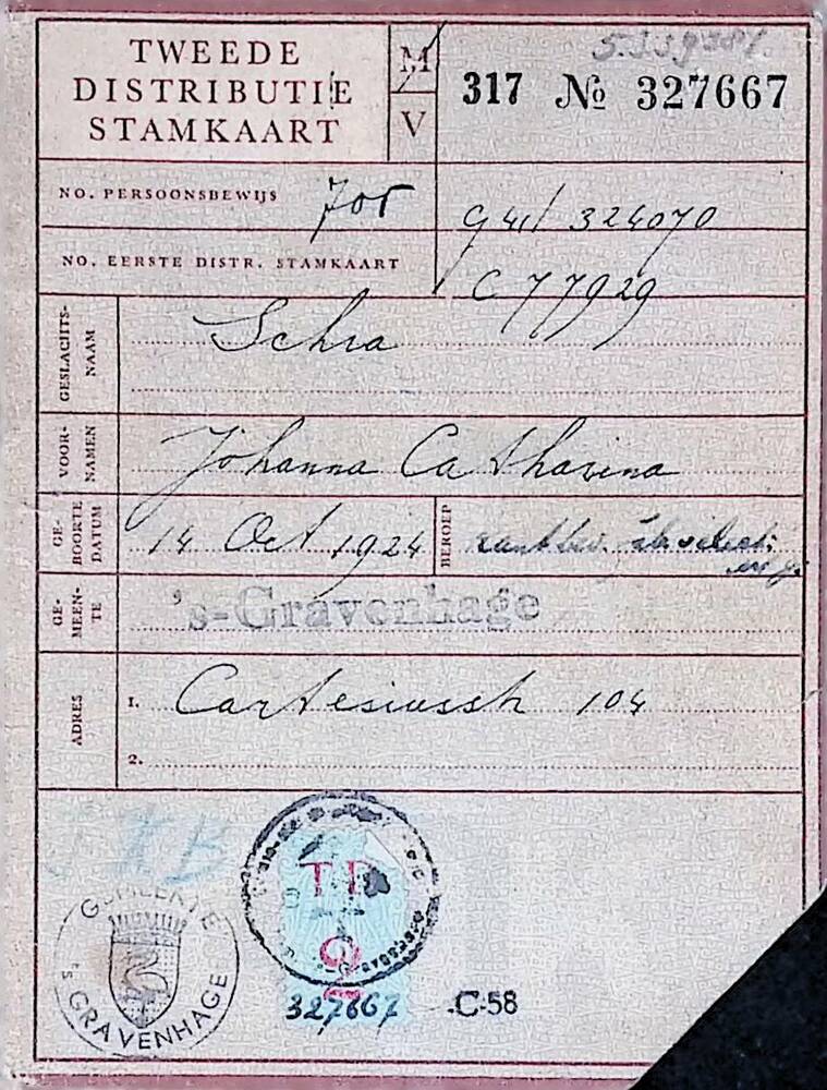 Tweede Distributiestamkaart op naam van J.C. Schra