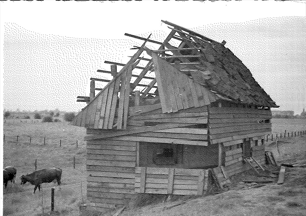 Foto van een verwoeste houten schuur, gebouwd op een...