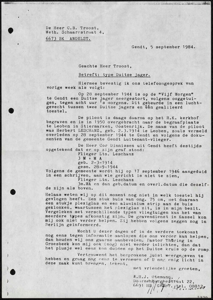 Brief betreffende een type Duitse Jager