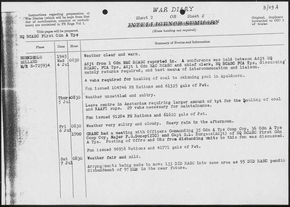 War Diary HQ RCASC First Canadian Army Troops 1-5-19...