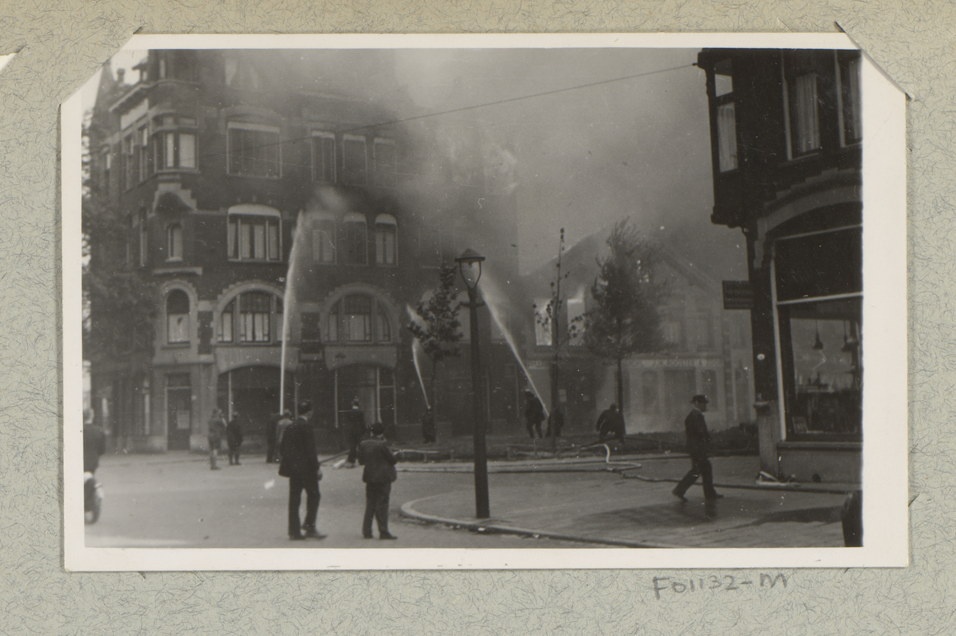 Blussen van brand, na het bombardement, in de Infirm...