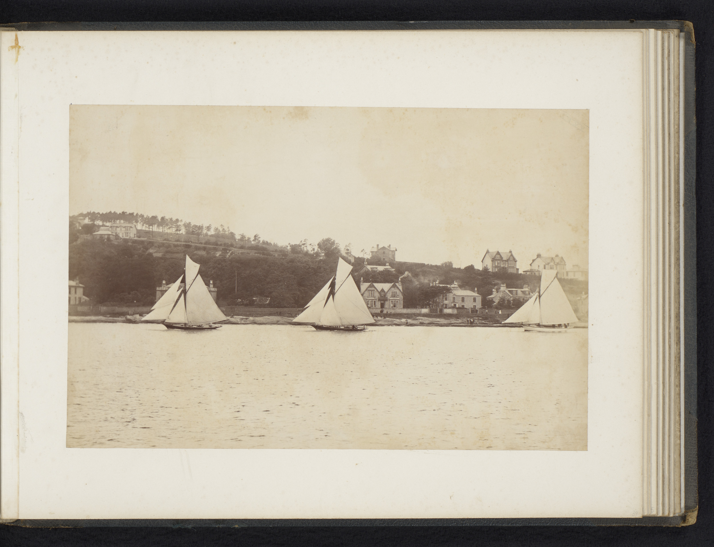 Drie zeilschepen, waaronder de Coila, te water met o...